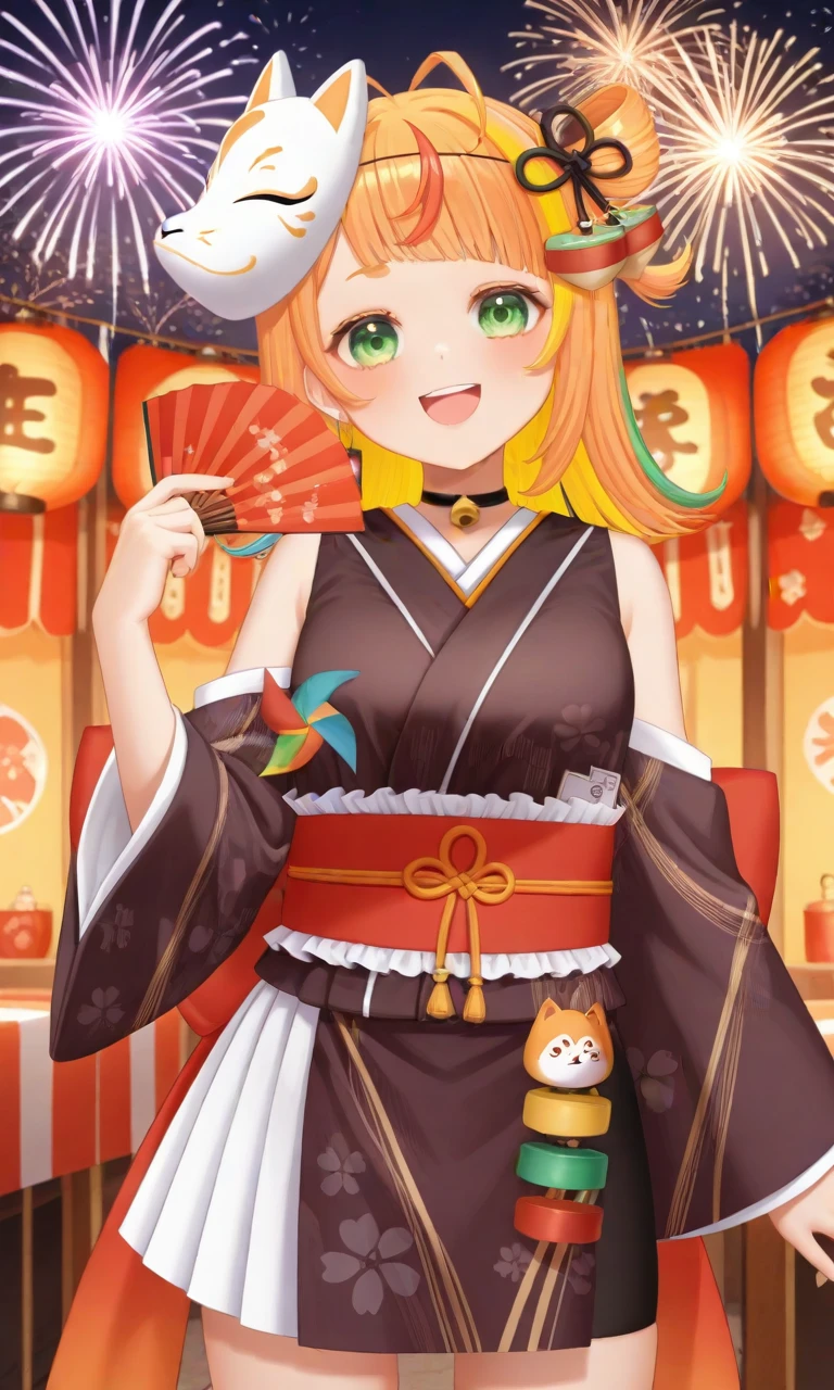 komawari koma, medium hair, single hair ring, hair ornament, fox mask, mask on head, kimono, obi, detached sleeves, choker, neck bell