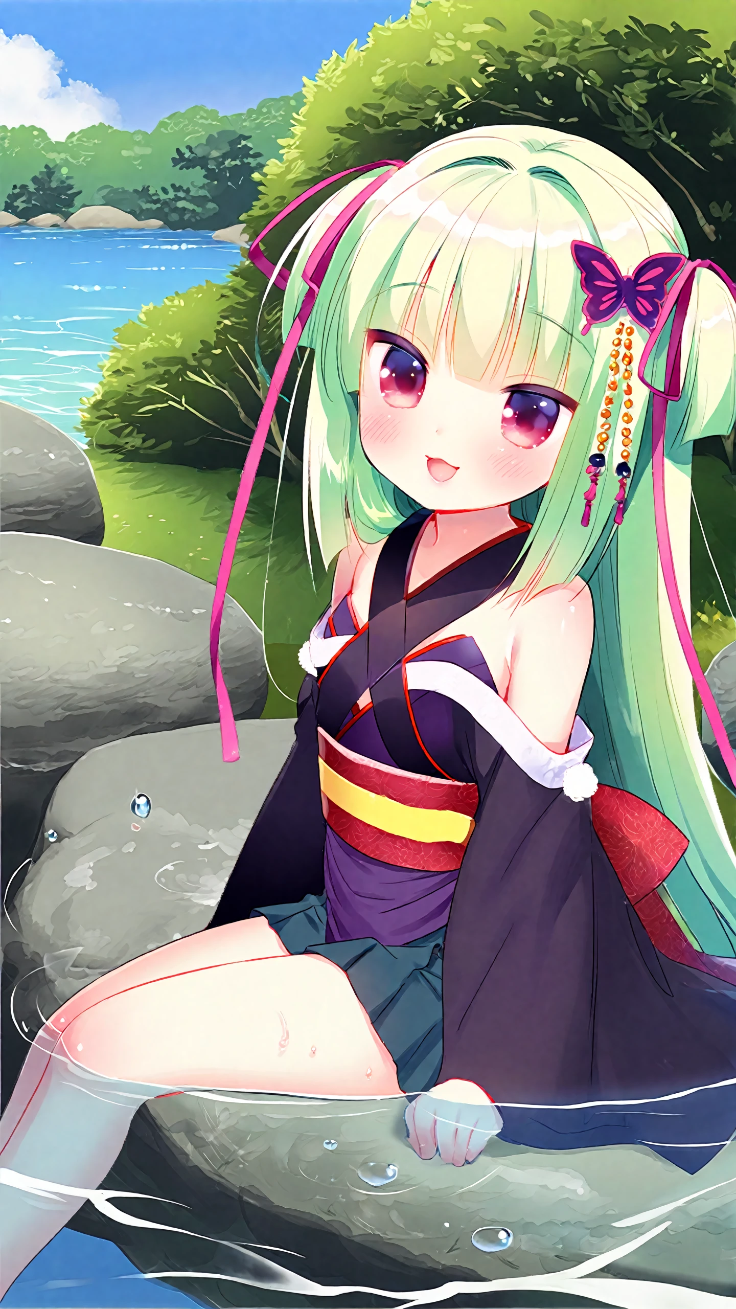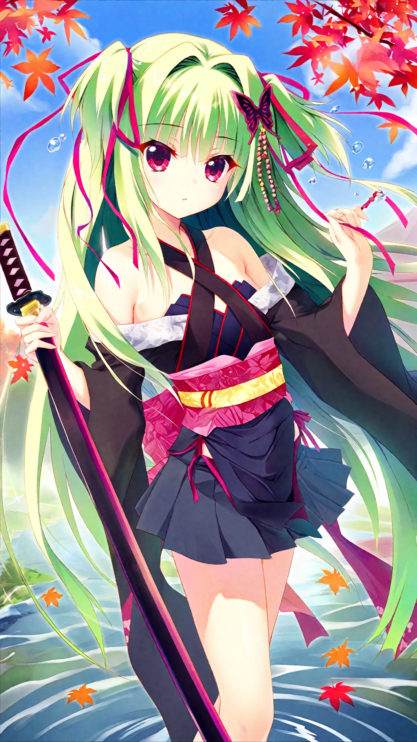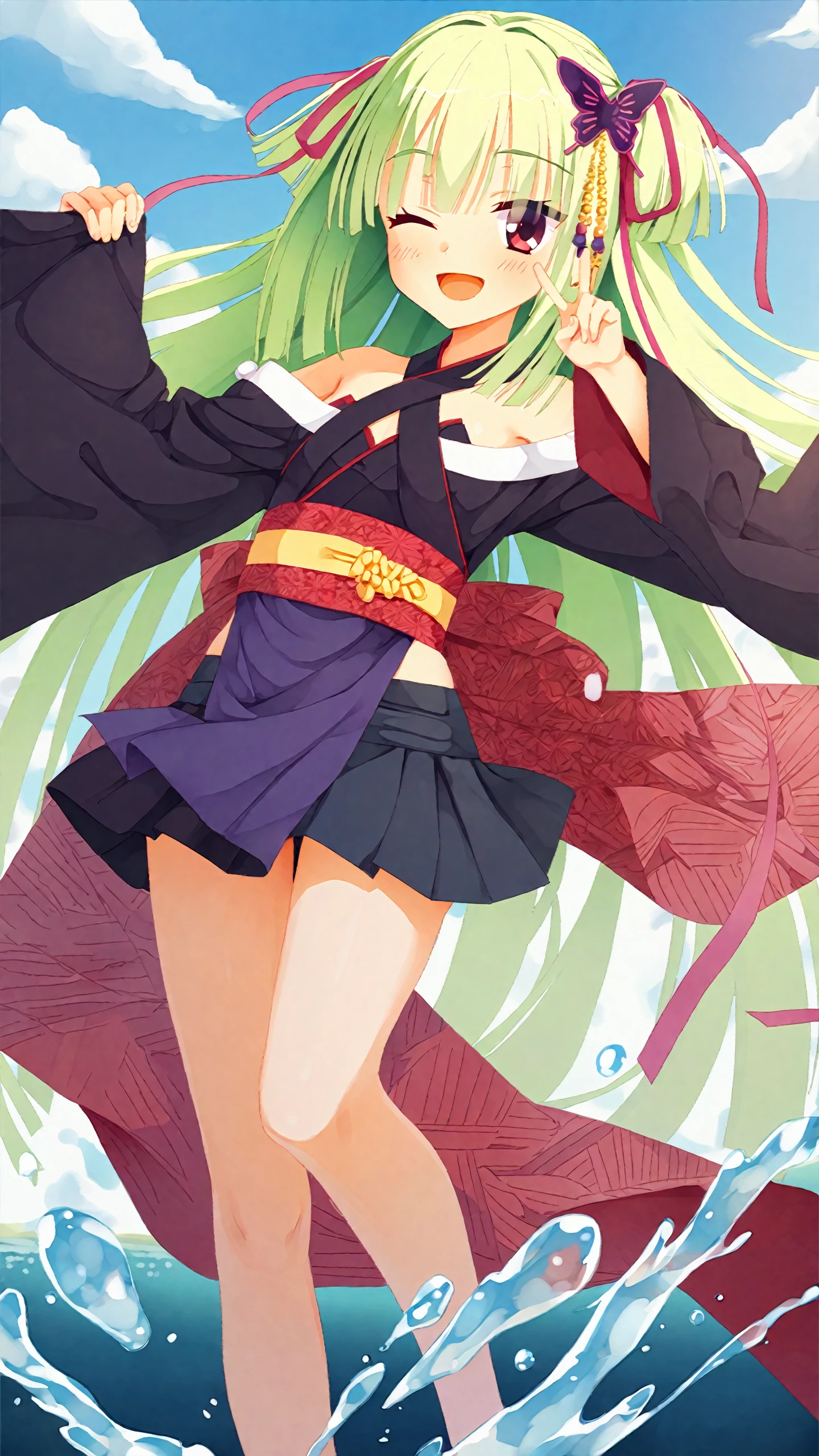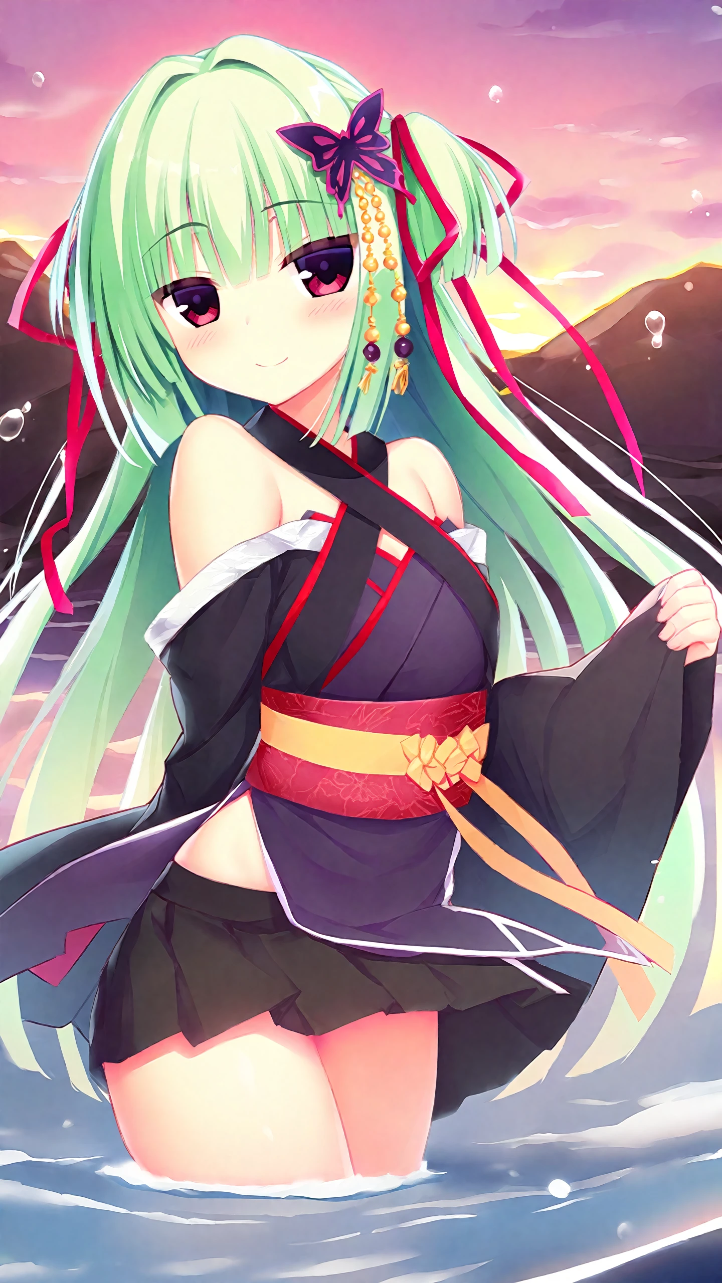 murasame \(senren\),bangs,bare shoulders,butterfly hair ornament,green hair,ribbon,black kimono,black pleated skirt,japanese clothes,kimono,long hair,obi,red eyes,sash,two side up,long sleeves,wide sleeves,