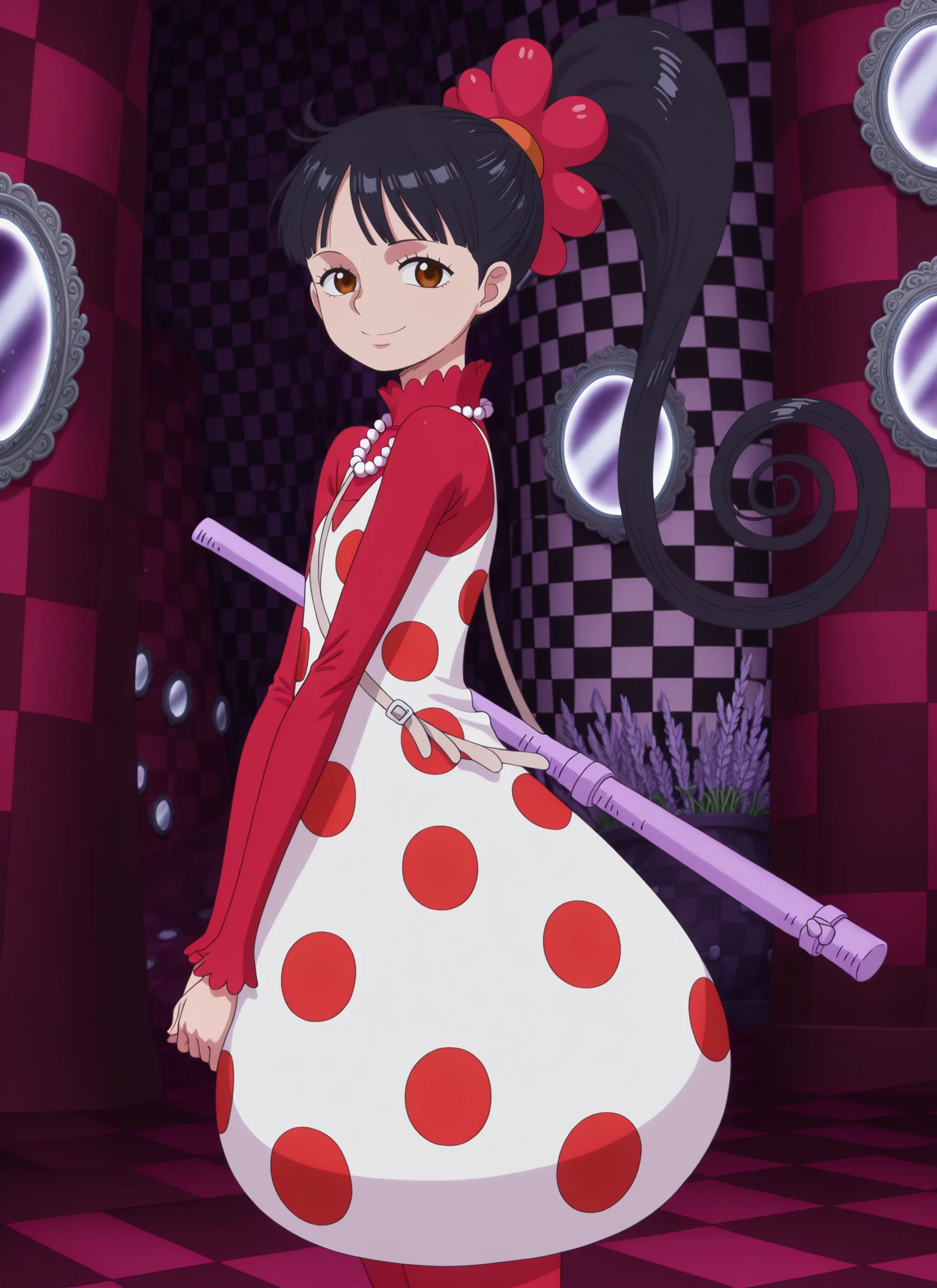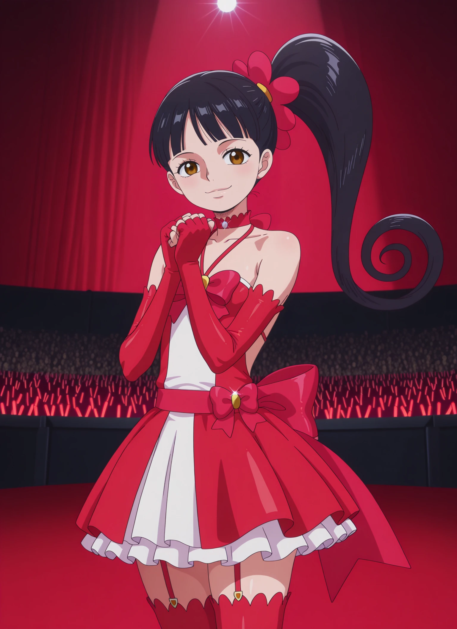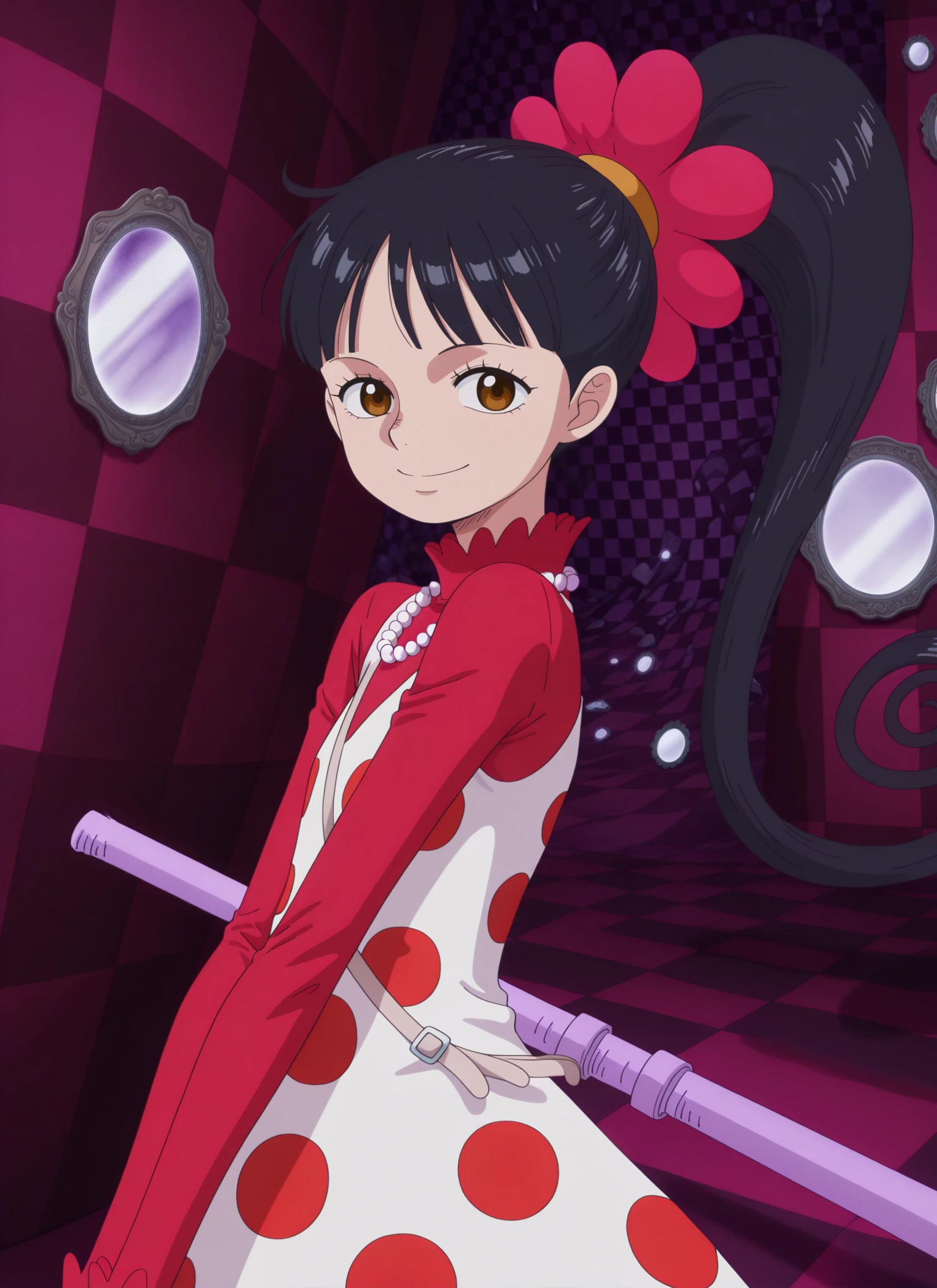 0n3p13c3_fl&mp3, brown eyes, black hair, long hair, high ponytail, spiral ponytail, red flower-shaped hair tie,