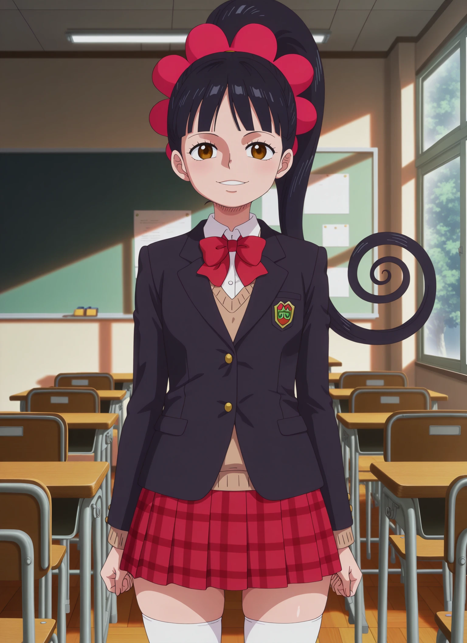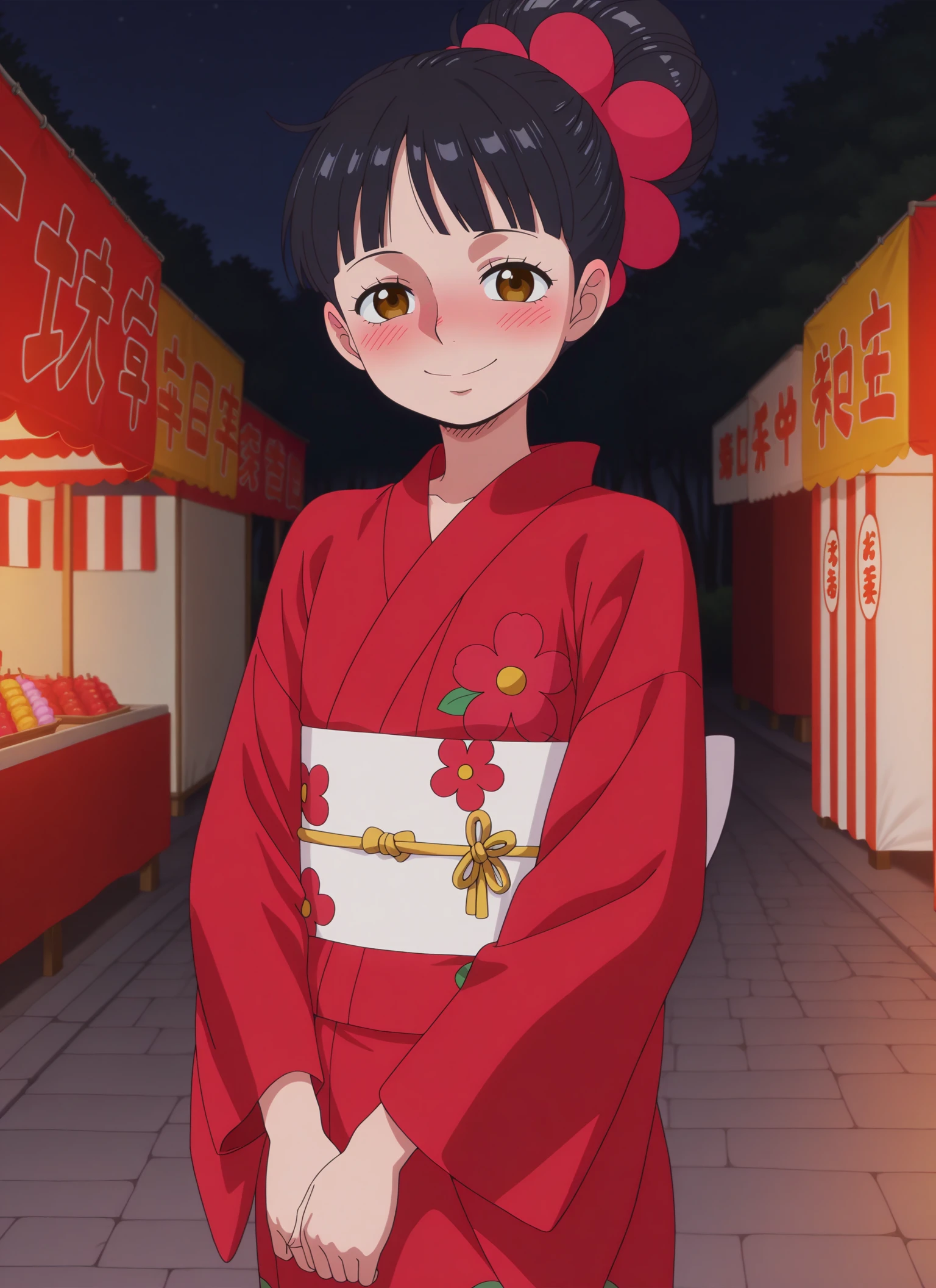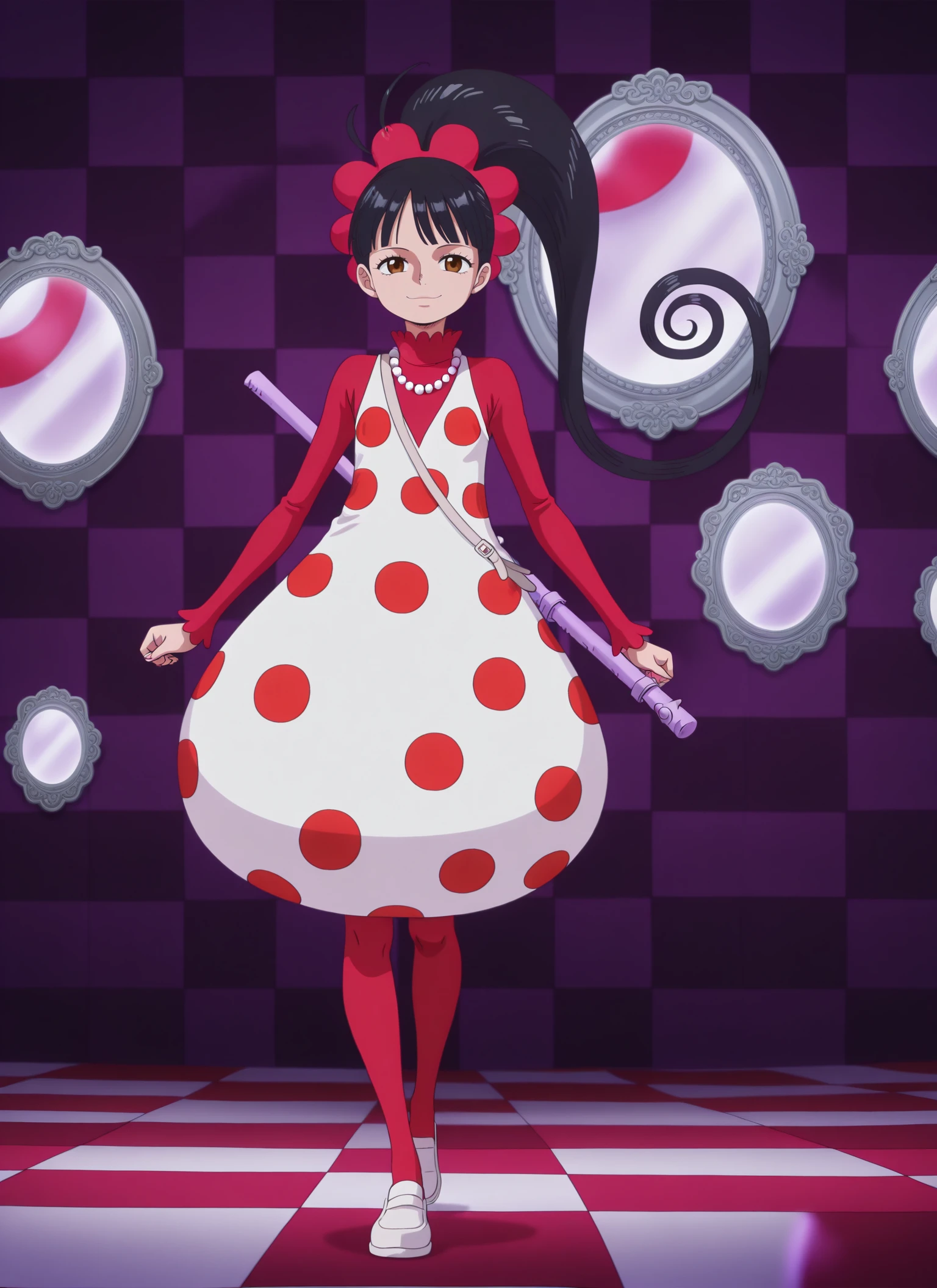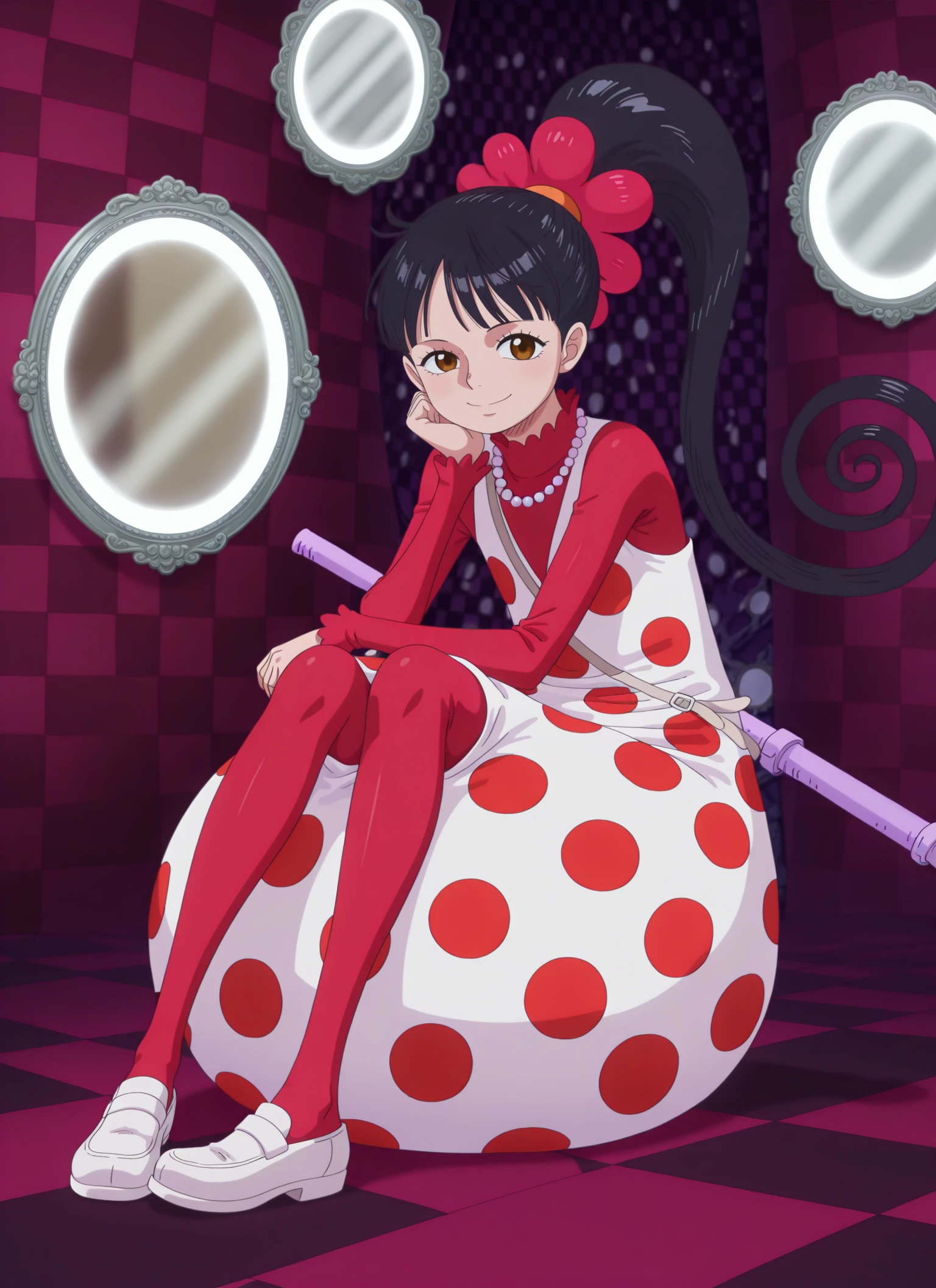 0n3p13c3_fl&mp3, brown eyes, black hair, long hair, high ponytail, spiral ponytail, red flower-shaped hair tie,