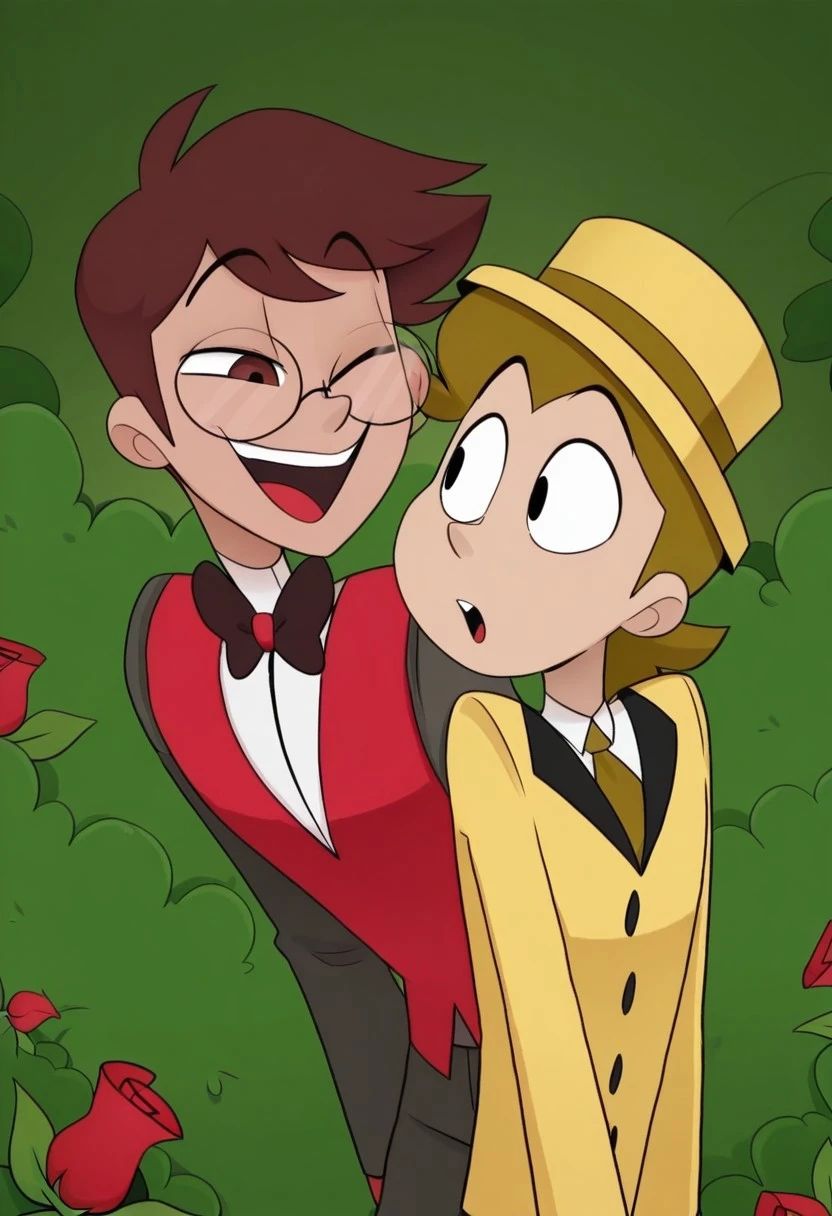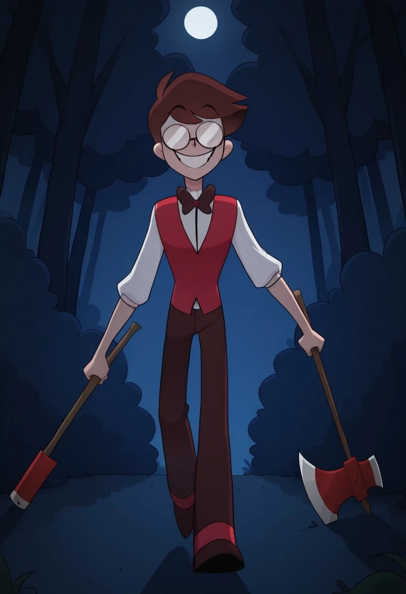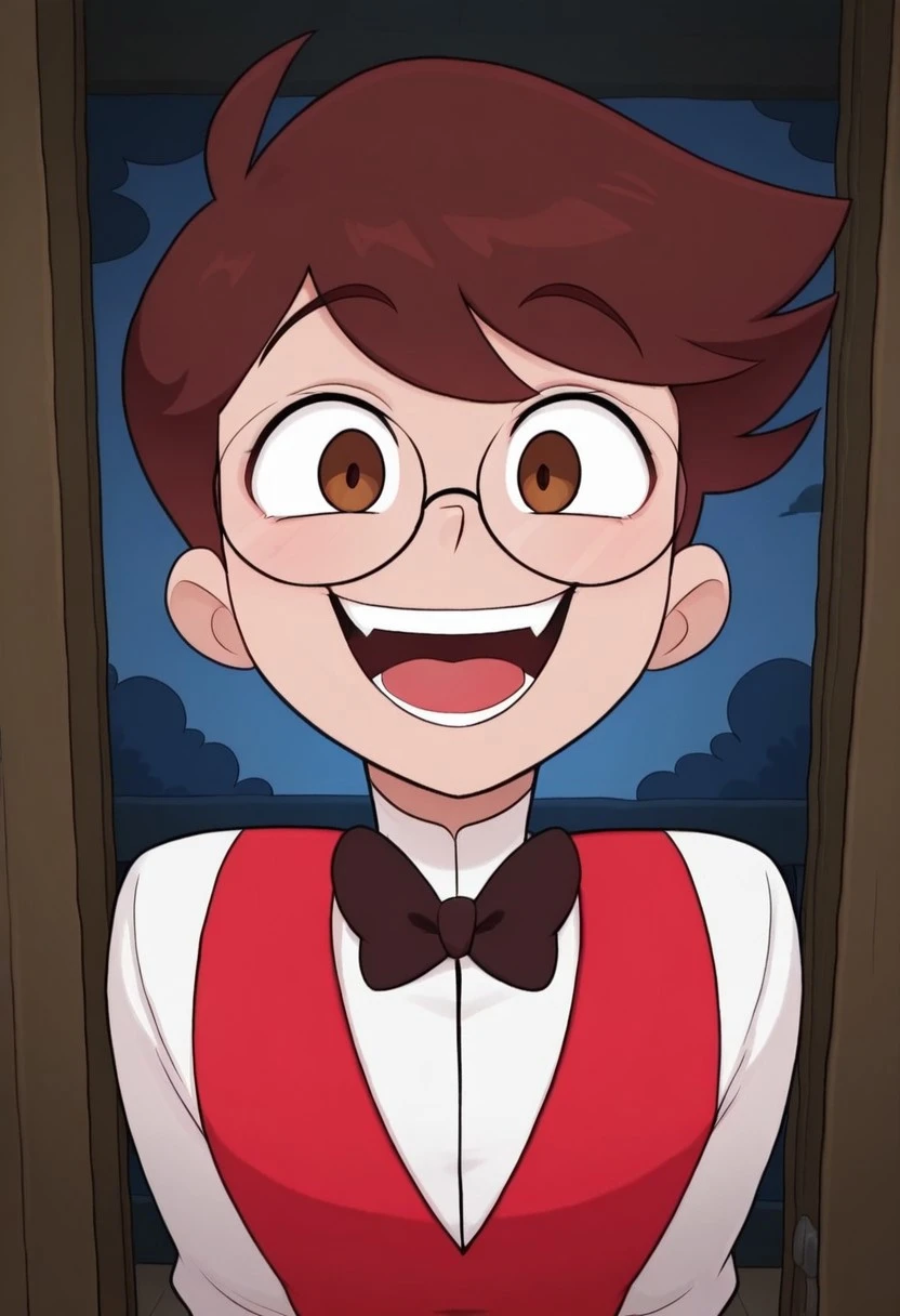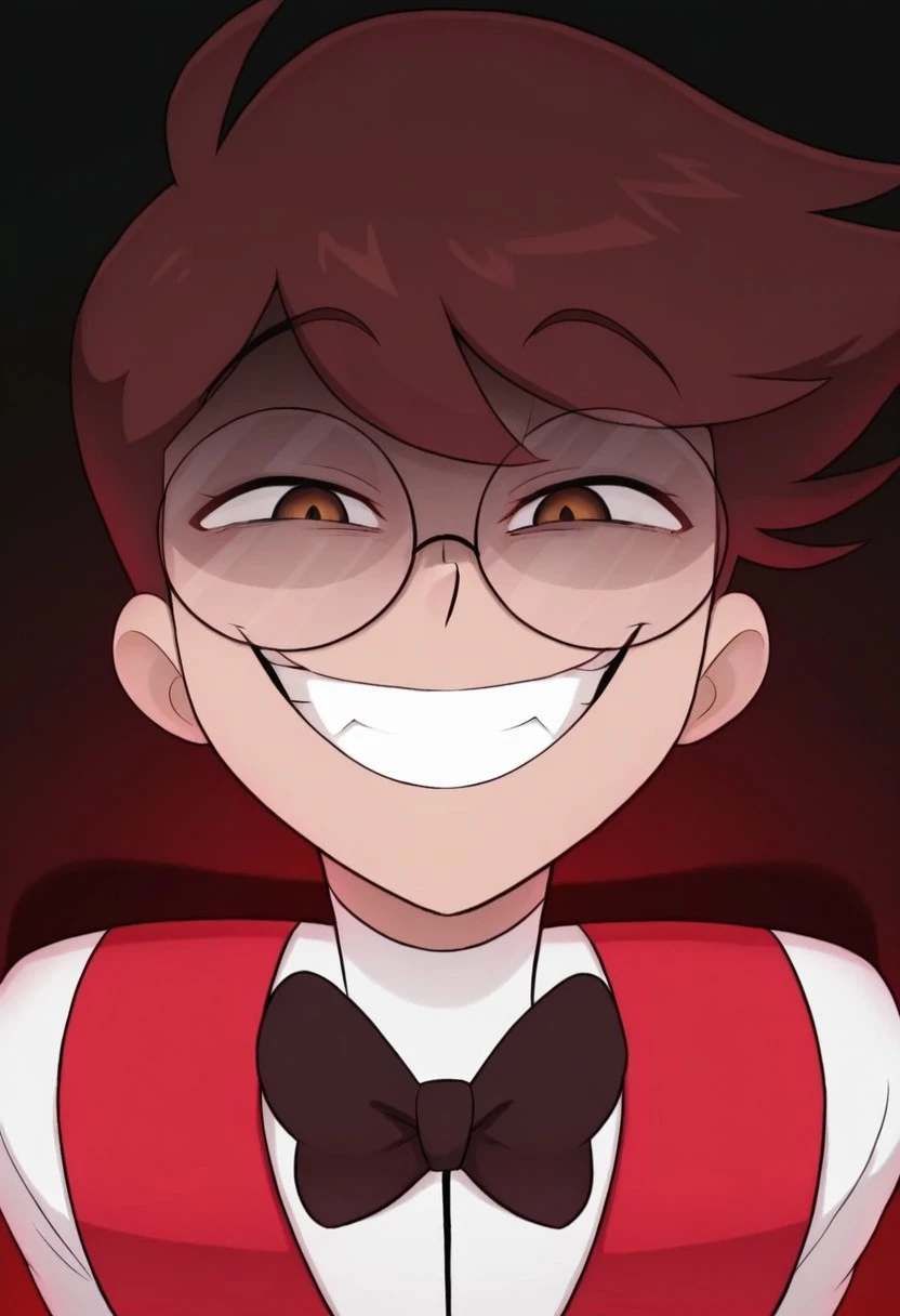 Human_Alastor, brown eyes, brown hair, glasses, red vest, white shirt, dark brown pants, dark brown shoes, dark brown bowtie