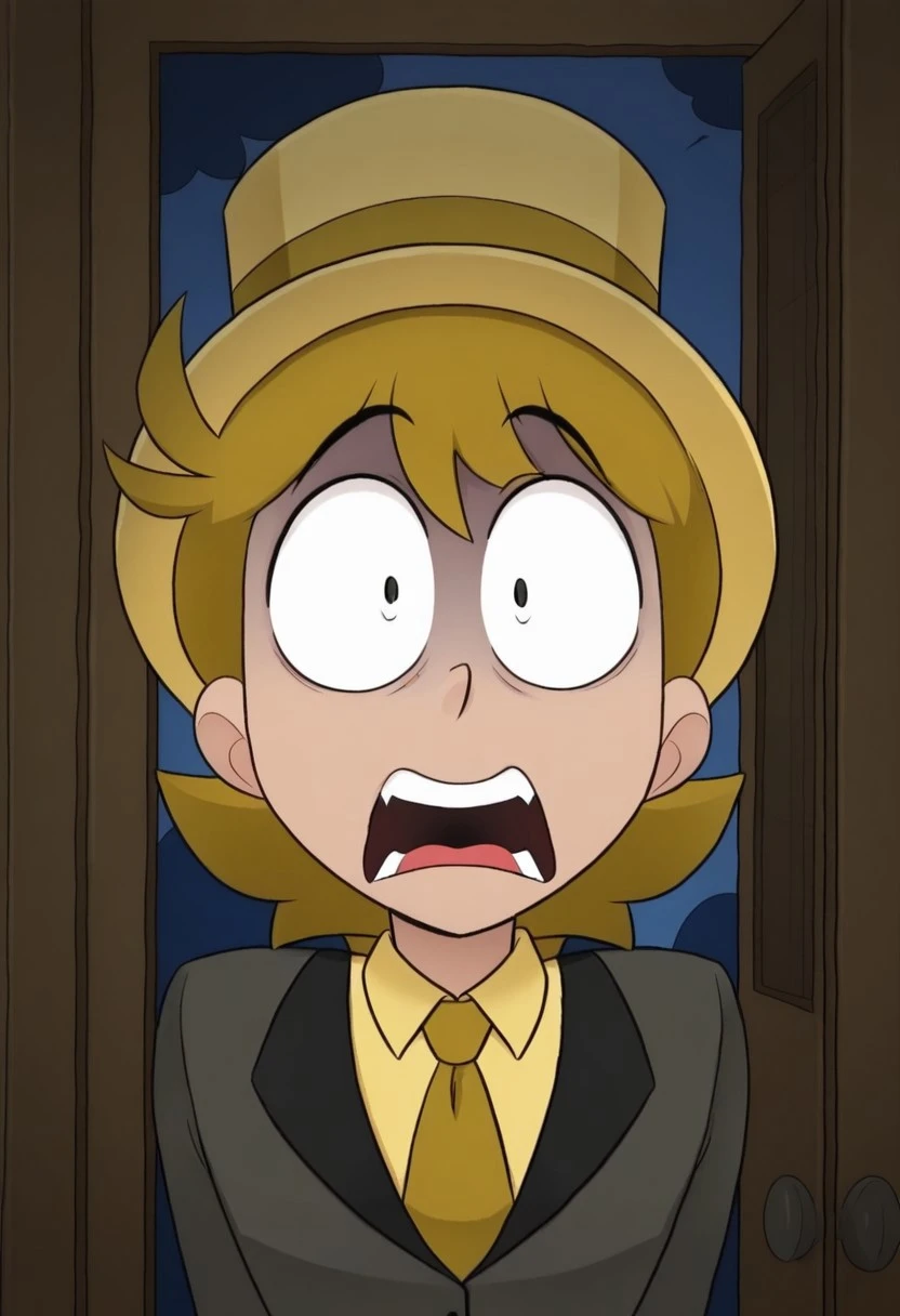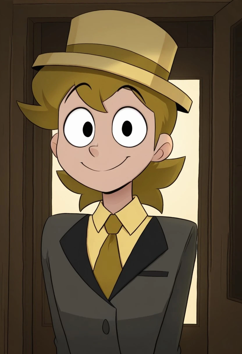 AlastV1ctim, light brown hair, brown hat, black eyes, brown tie, yellow shirt, black suit, black pants, black shoes