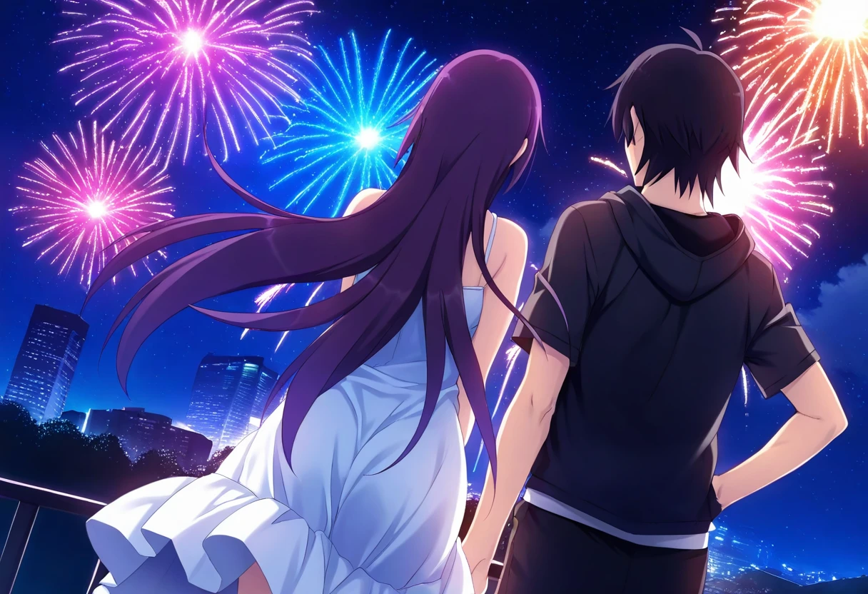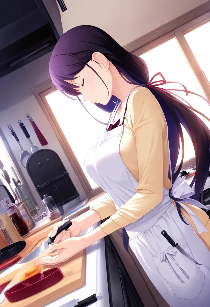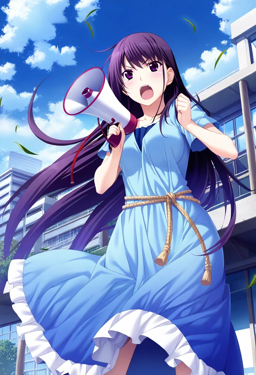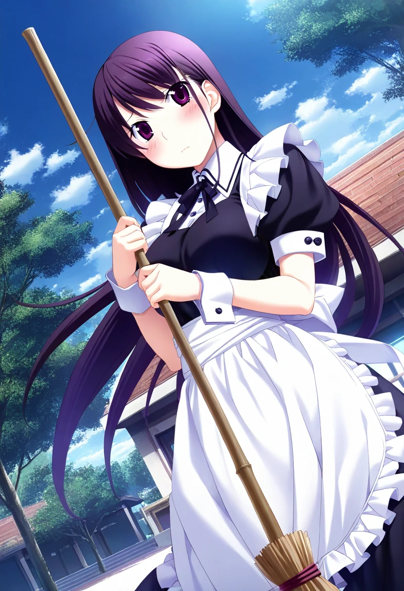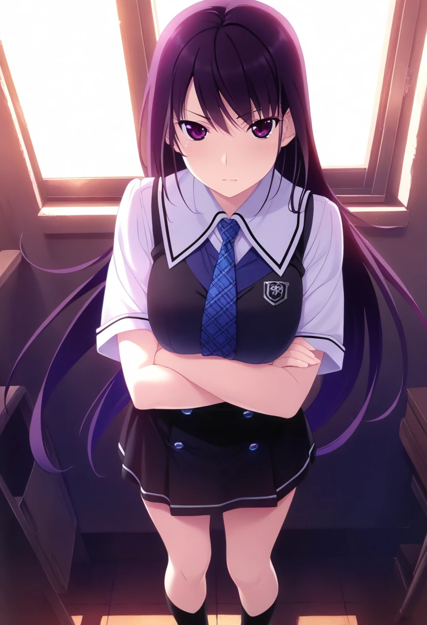 yumiko,1girl,standing,school uniform,purple hair,long hair,tsurime,purple eyes,blue necktie,black skirt,black socks,