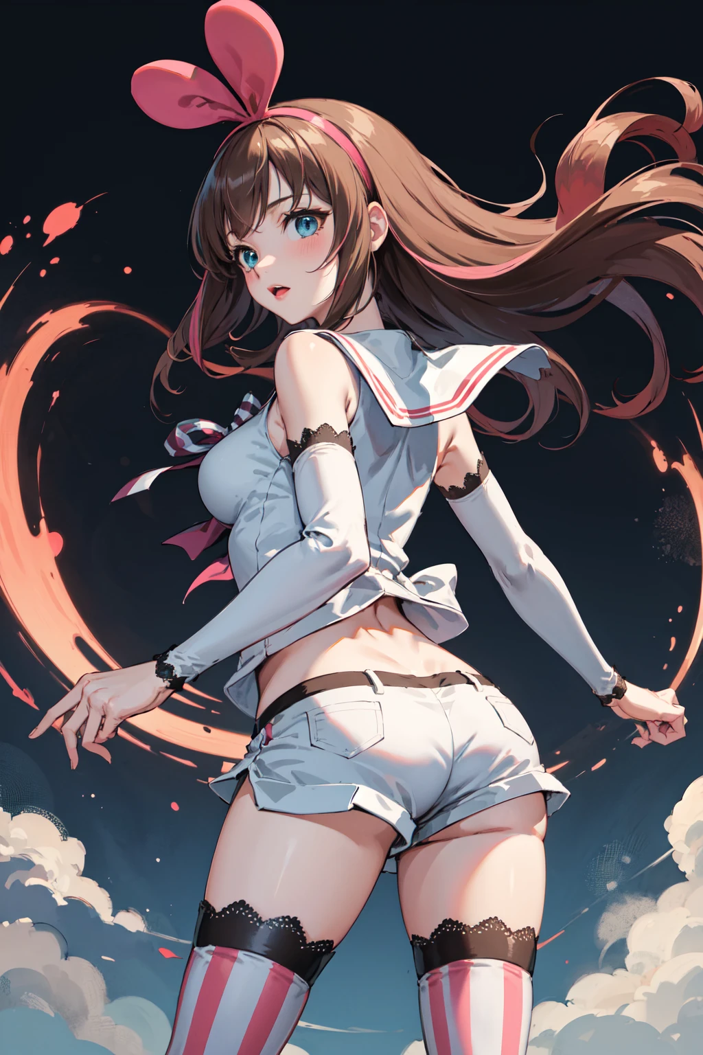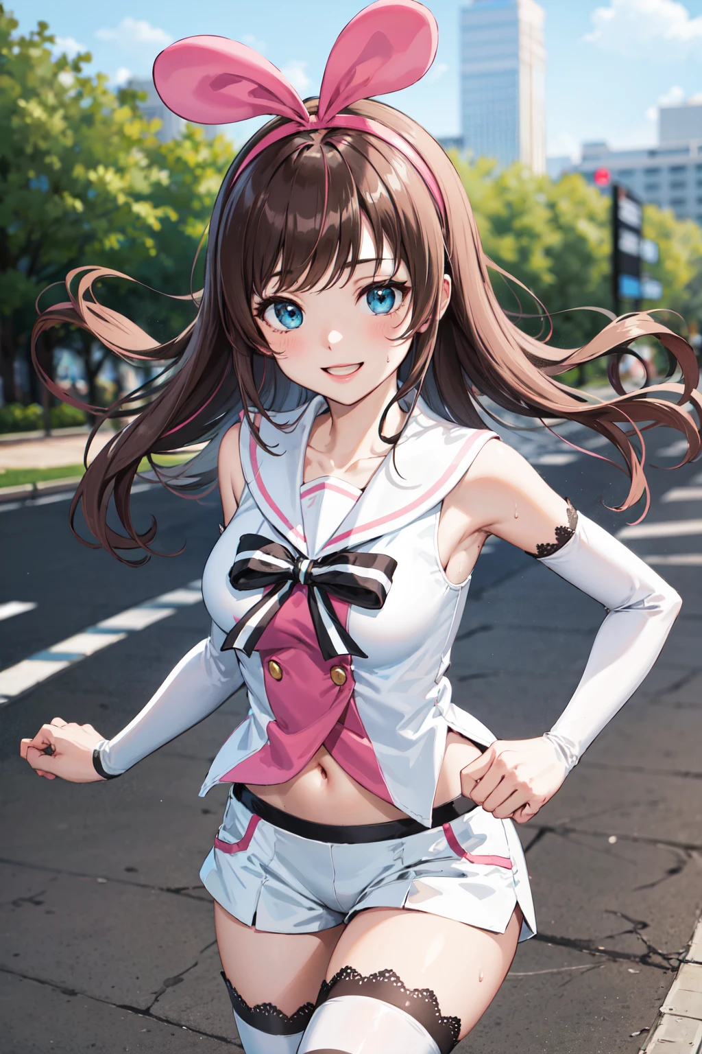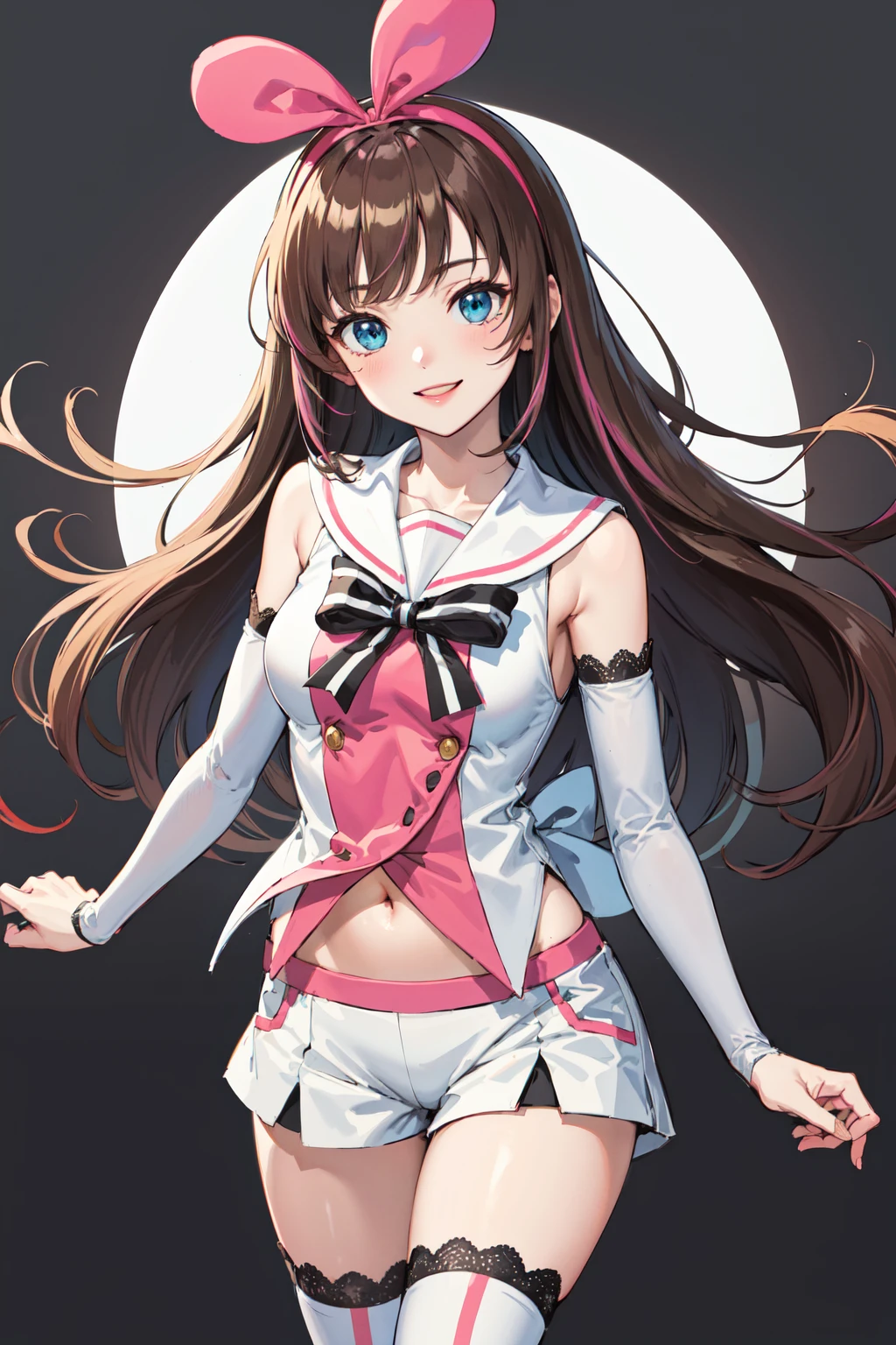kizuna ai, long hair, brown hair, multicolored hair, short shorts, pink hairband, white shorts, detached sleeves, pink hair, blue eyes, white thighhighs, breasts, sleeveless shirt, white sailor collar, bowtie, hair bow, white shirt, lace-trimmed legwear