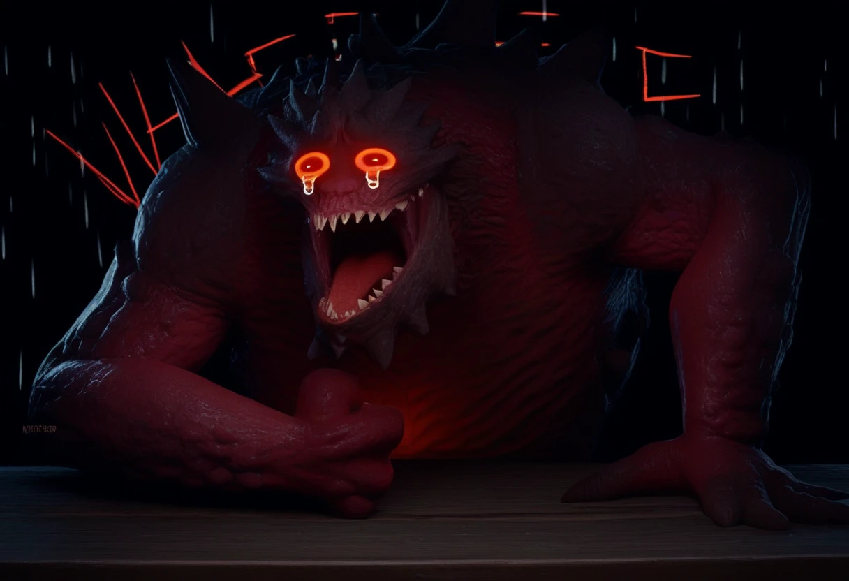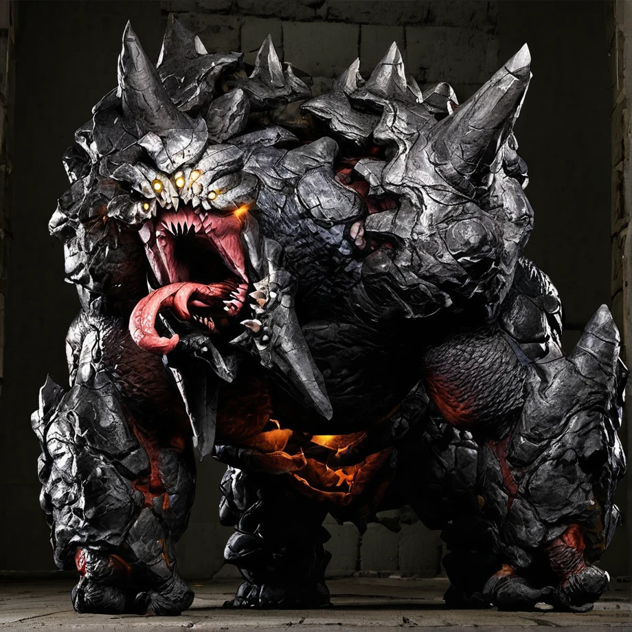 Giant, rounded head , long tongue shooting from mouth, glowing mouth, scale armor, full body , mandibles on the lower jaw, mouth closed, all fours, hind legs, sharp teeth, thick hide , spikes , barbs, glowing body, glowing eyes,