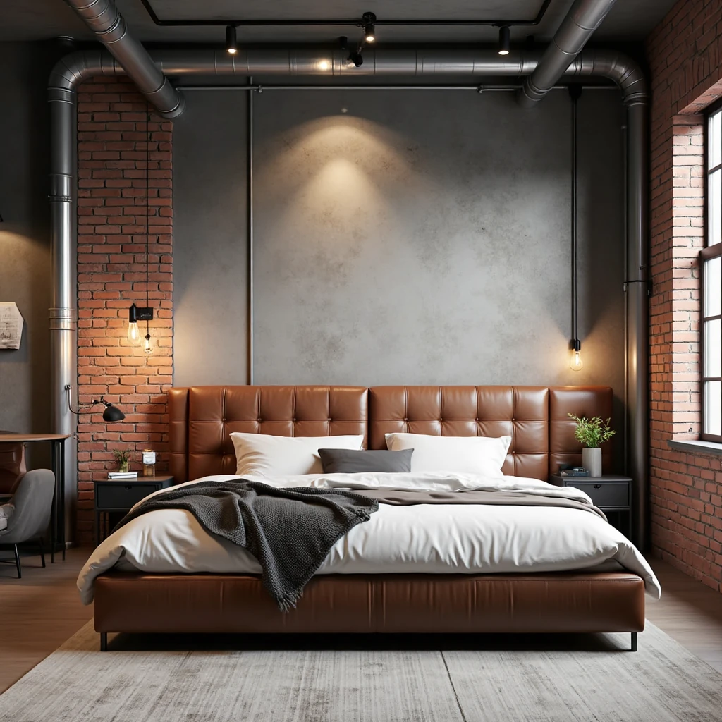 Industrial style interior design, urban loft, brick and concrete mix, metal furniture legs, leather - upholstered beds, Edison bulb chandeliers.