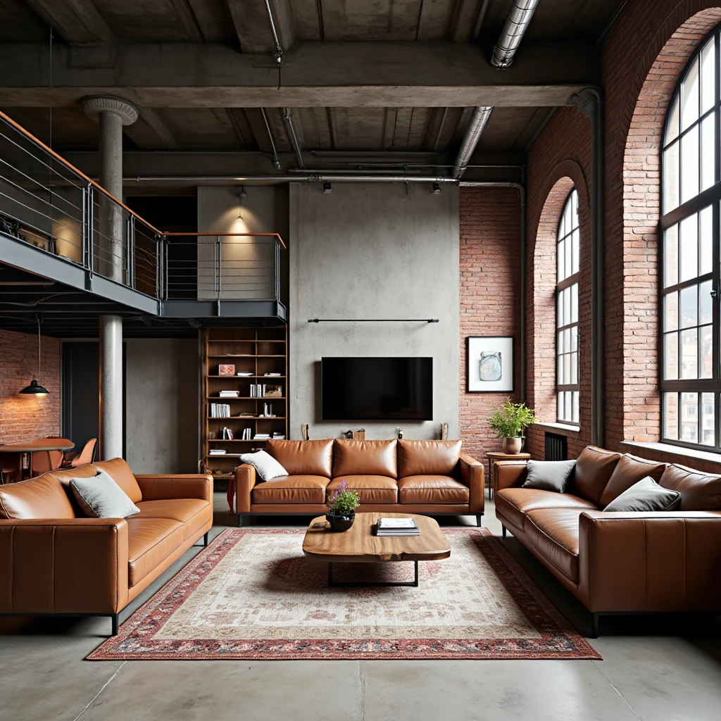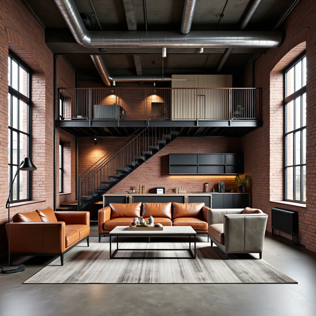 Industrial style interior design, loft - like space, brick - clad walls, metal staircases, leather armchairs, concrete - topped dining tables.