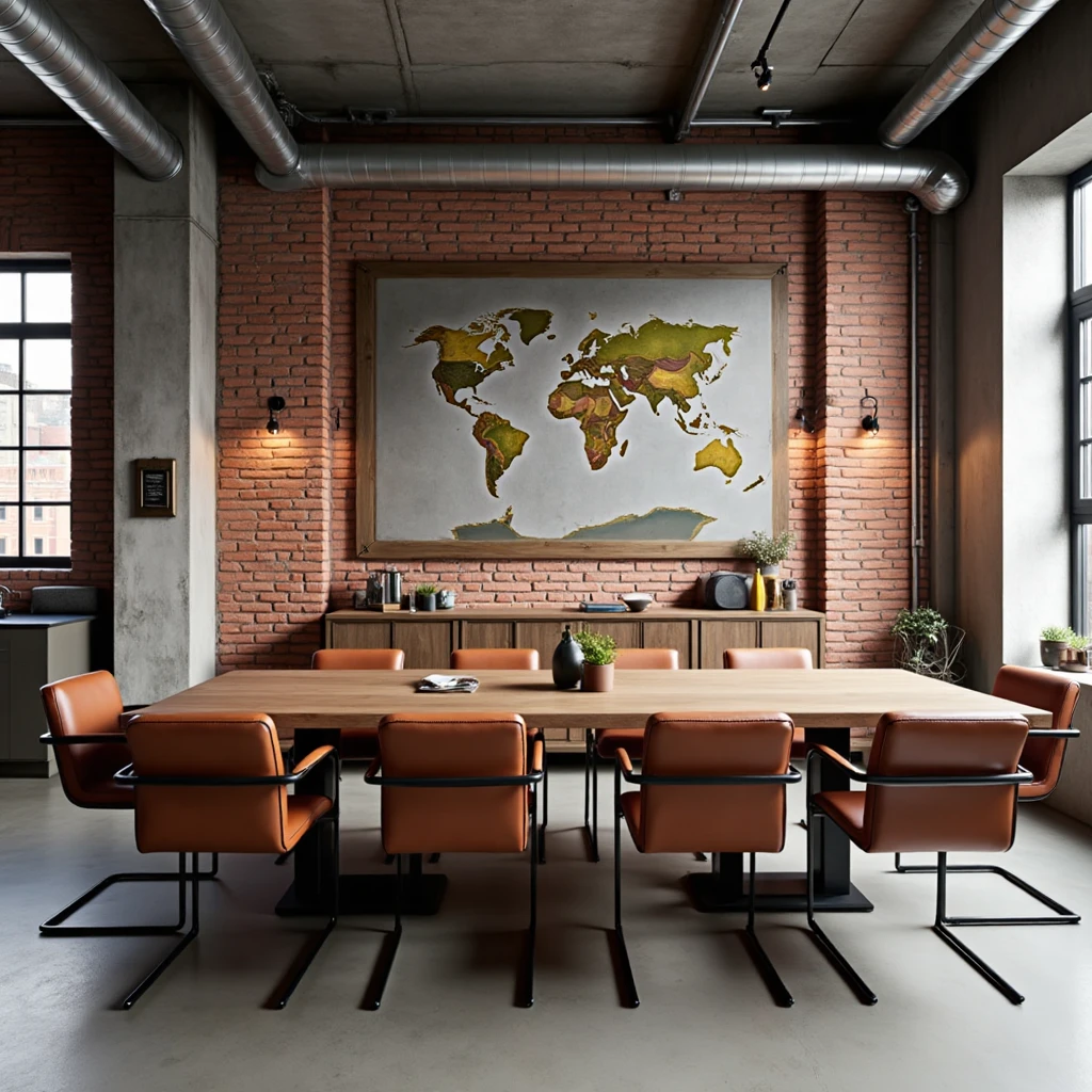 Industrial style interior design, rustic industrial, weathered wood, exposed brick, leather - and - metal chairs, industrial - style wall art.
