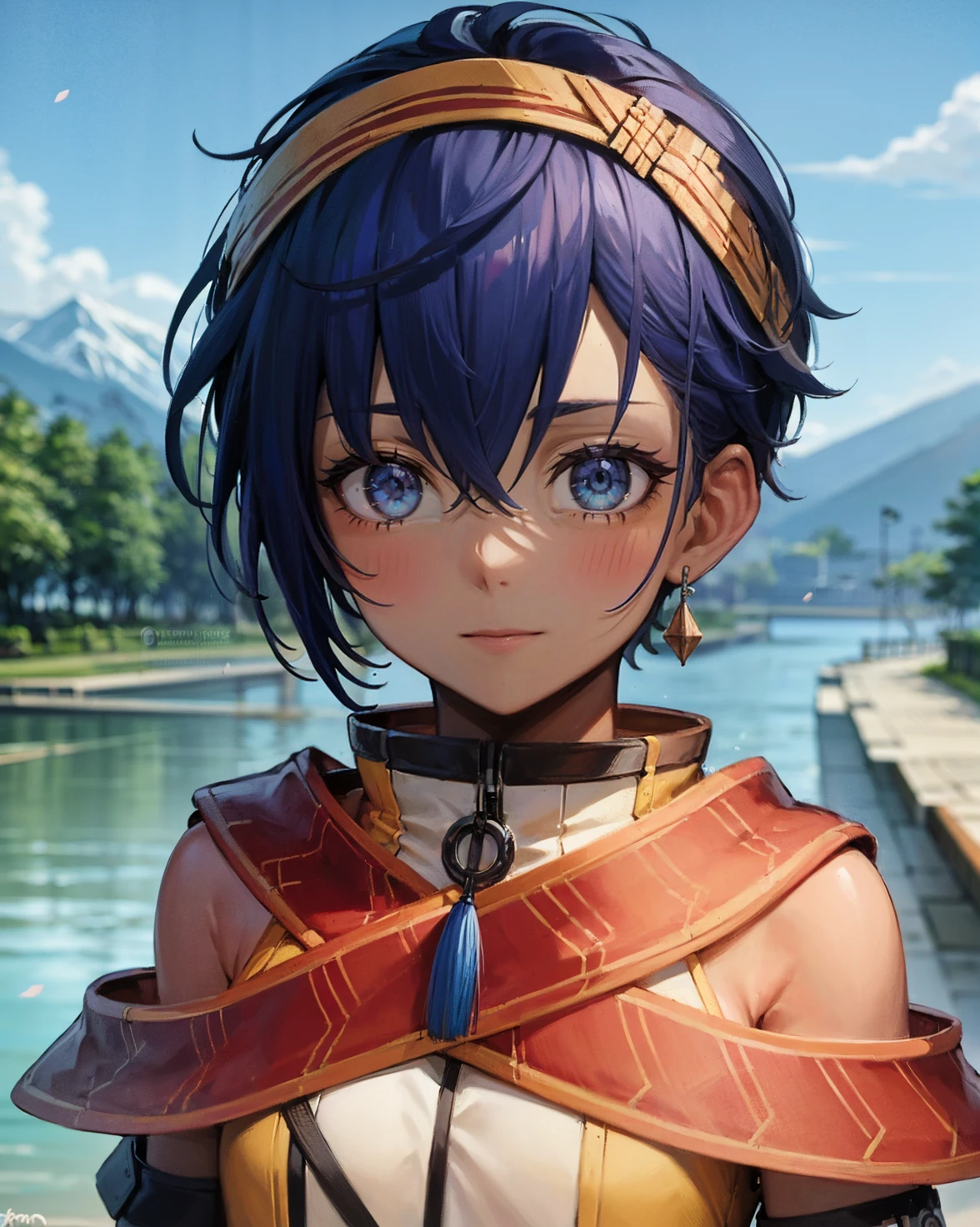 <lora:Feri:0.8> Feri Al-Fayed, blue_eyes, dark_blue_hair, short_hair, small breasts, flat_chest, petite, dark skin, young, short,
