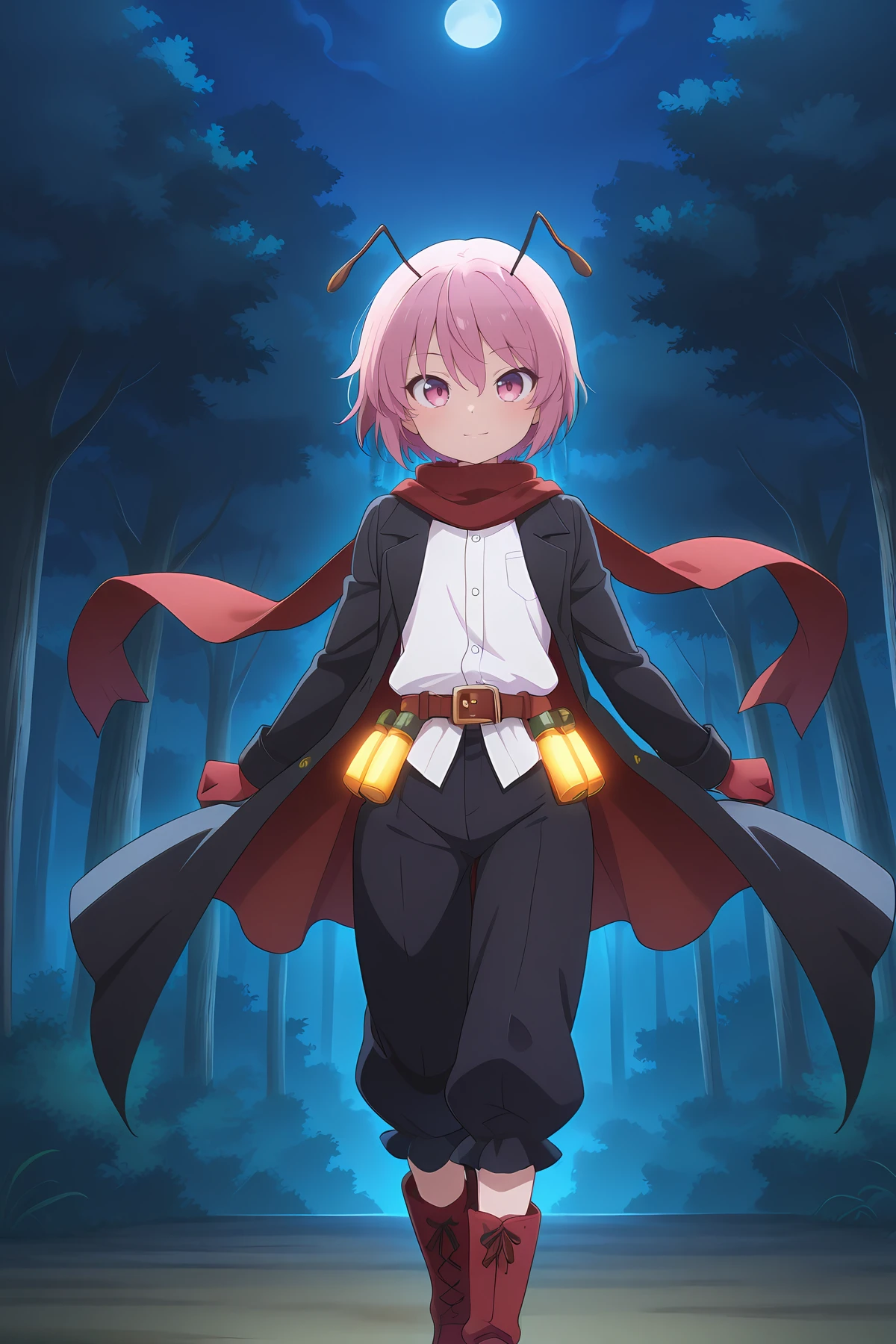 wriggle nightbug, 1girl, solo, pink eyes, pink hair, short hair, hair between eyes, antennae,, wriggle nightbug \(kaiju of augmentation and mutation\), alternate eye color, alternate hair color, belt, black coat, black pants, boots, gloves, long sleeves, open clothes, open coat, pants,   red footwear, red gloves, red scarf, rider belt, shirt, white shirt,