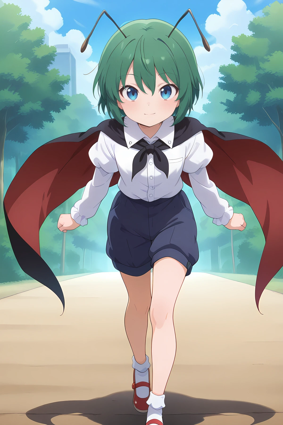 wriggle nightbug, 1girl, solo, blue eyes, green hair, short hair, hair between eyes, antennae,