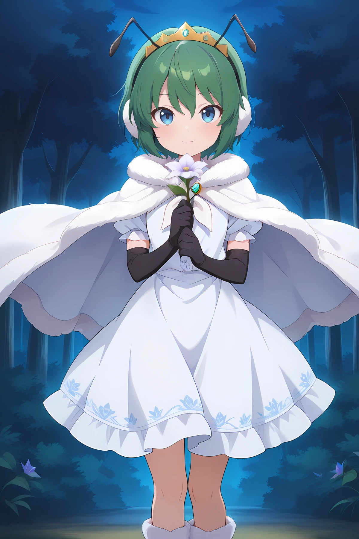 alternate costume, bellflower, black gloves, earmuffs, elbow gloves, floral dress, fur-trimmed footwear, (short cape, white cape, fur cape, fur trim cape:1.4), gloves, gold crown, holding flower, puffy short sleeves, puffy sleeves, white dress, white flower, white footwear, white necktie,