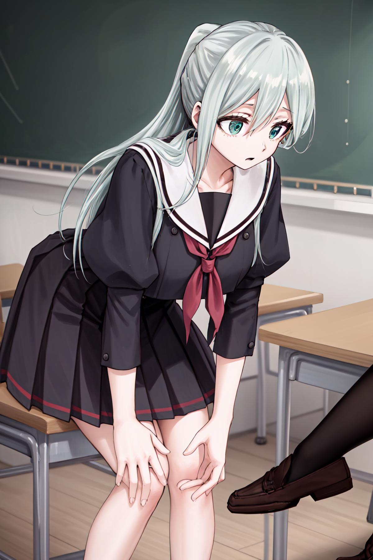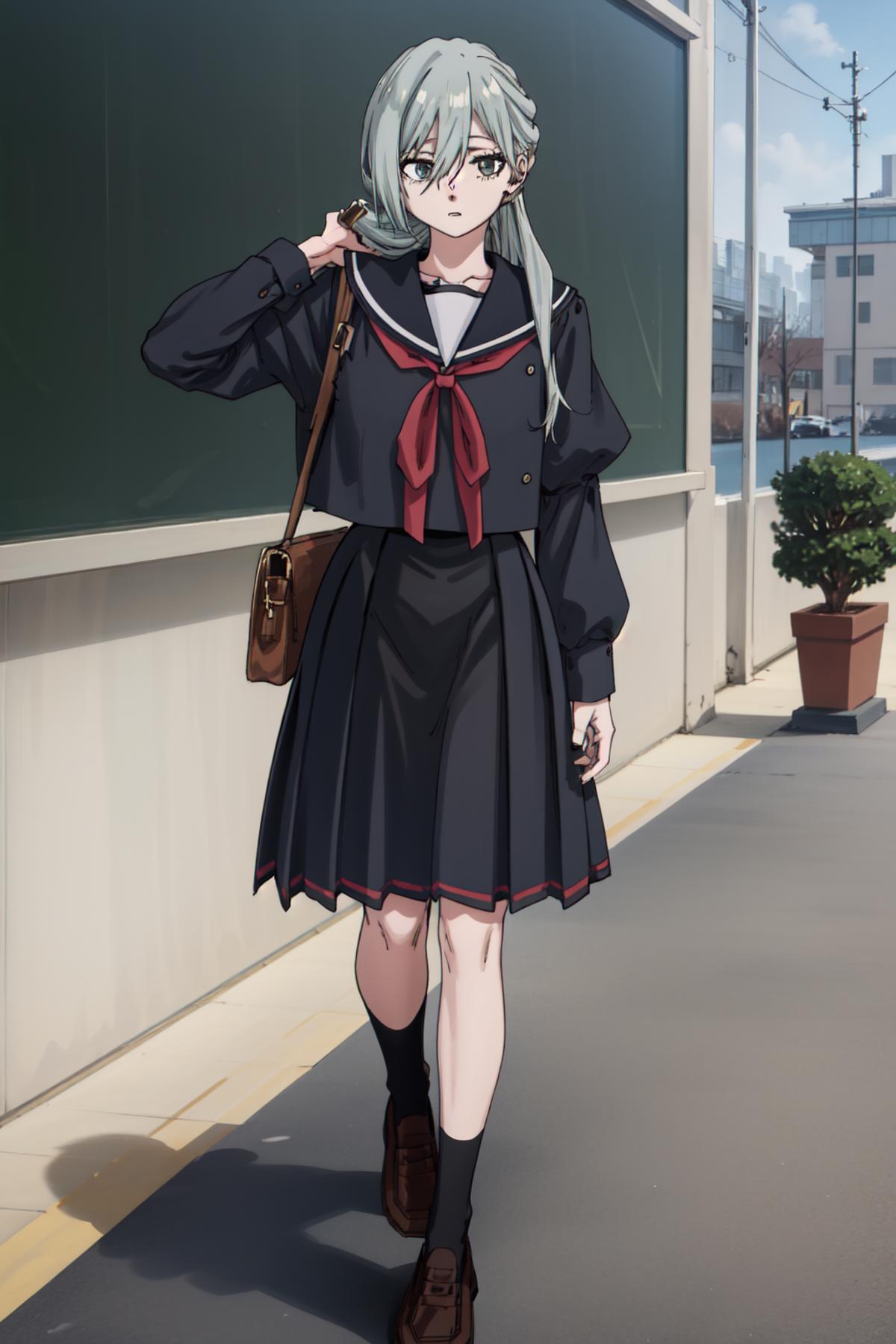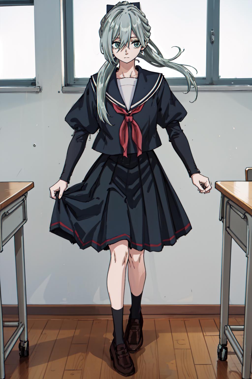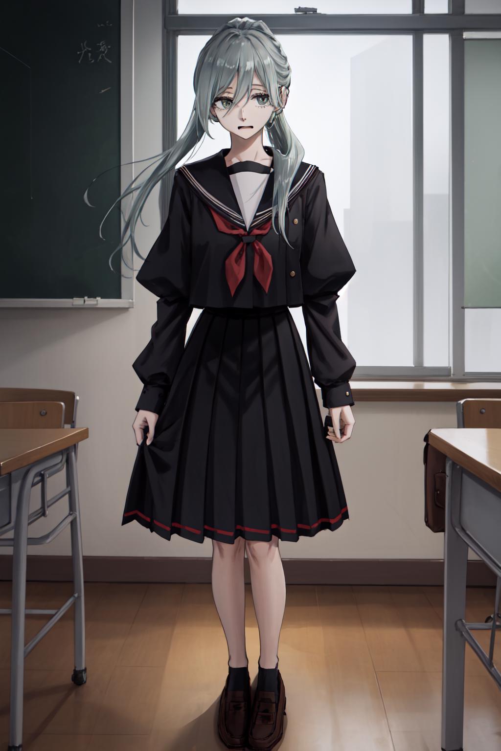 1girl, solo, long hair, skirt, shirt, long sleeves, ponytail, grey hair,