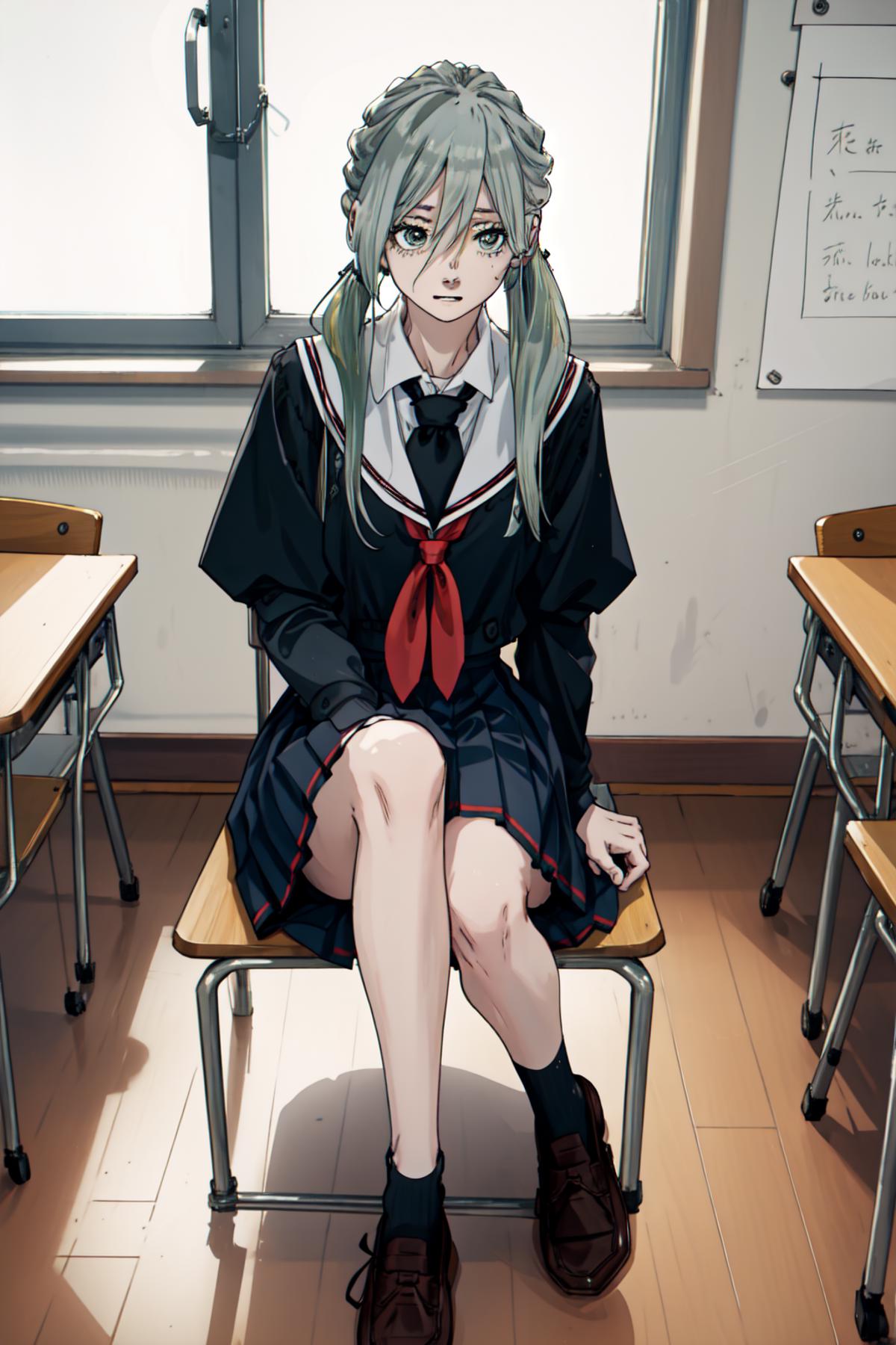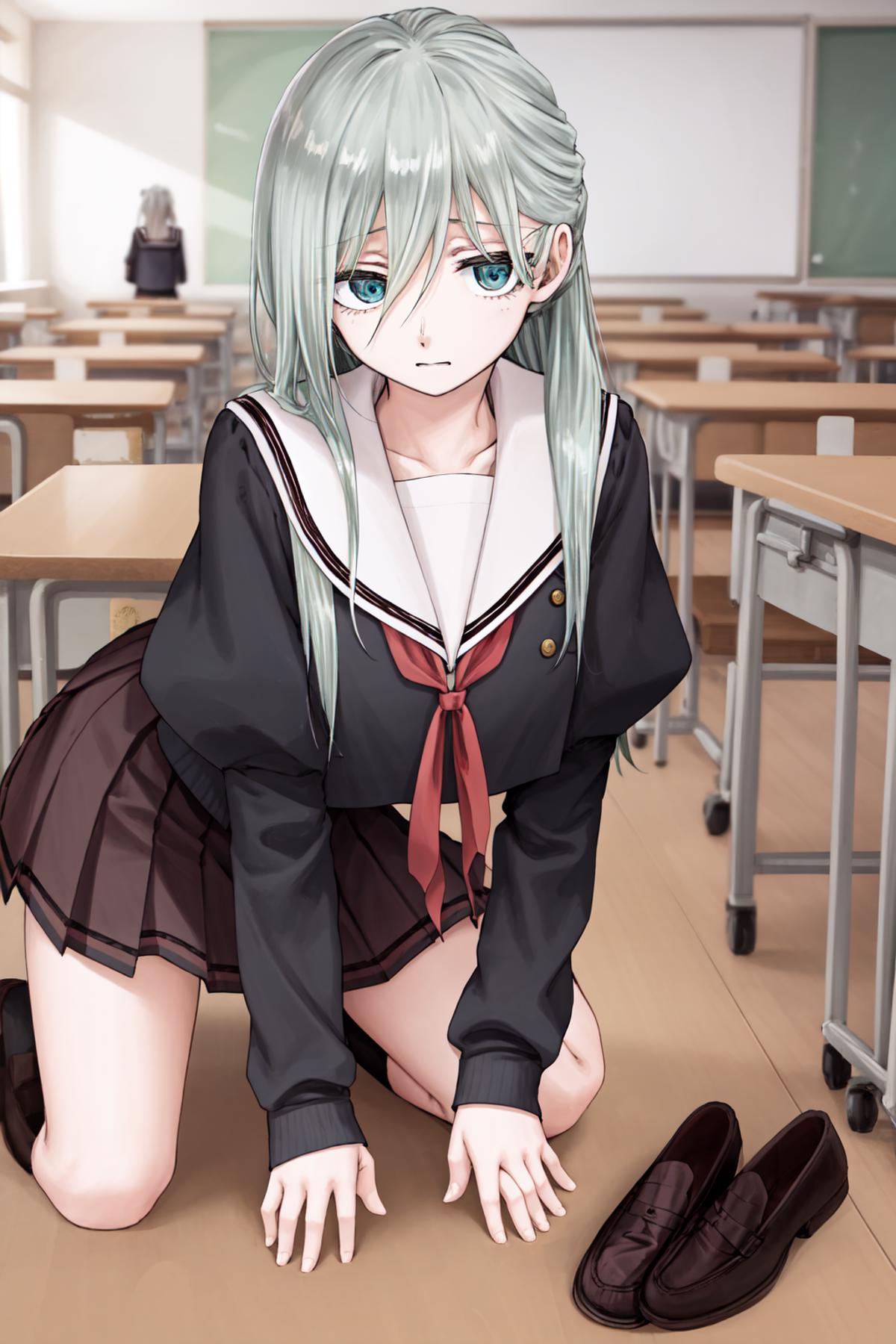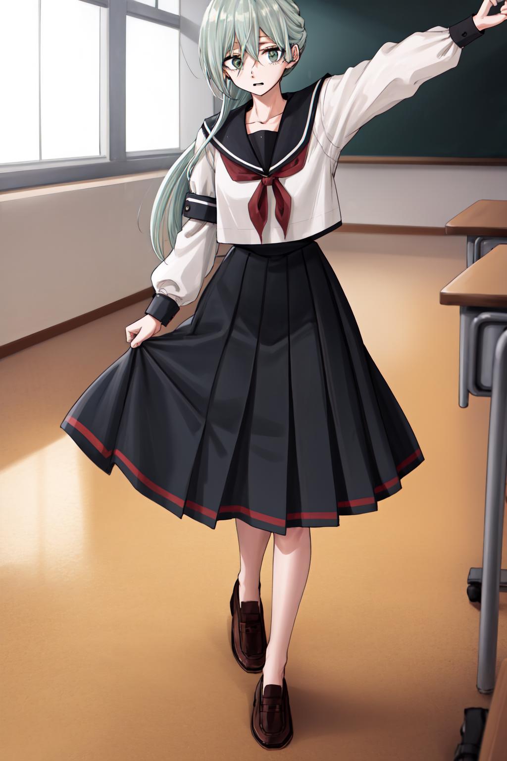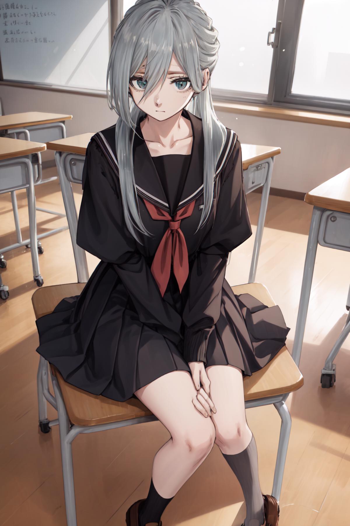 1girl, solo, long hair, skirt, shirt, long sleeves, ponytail, grey hair,