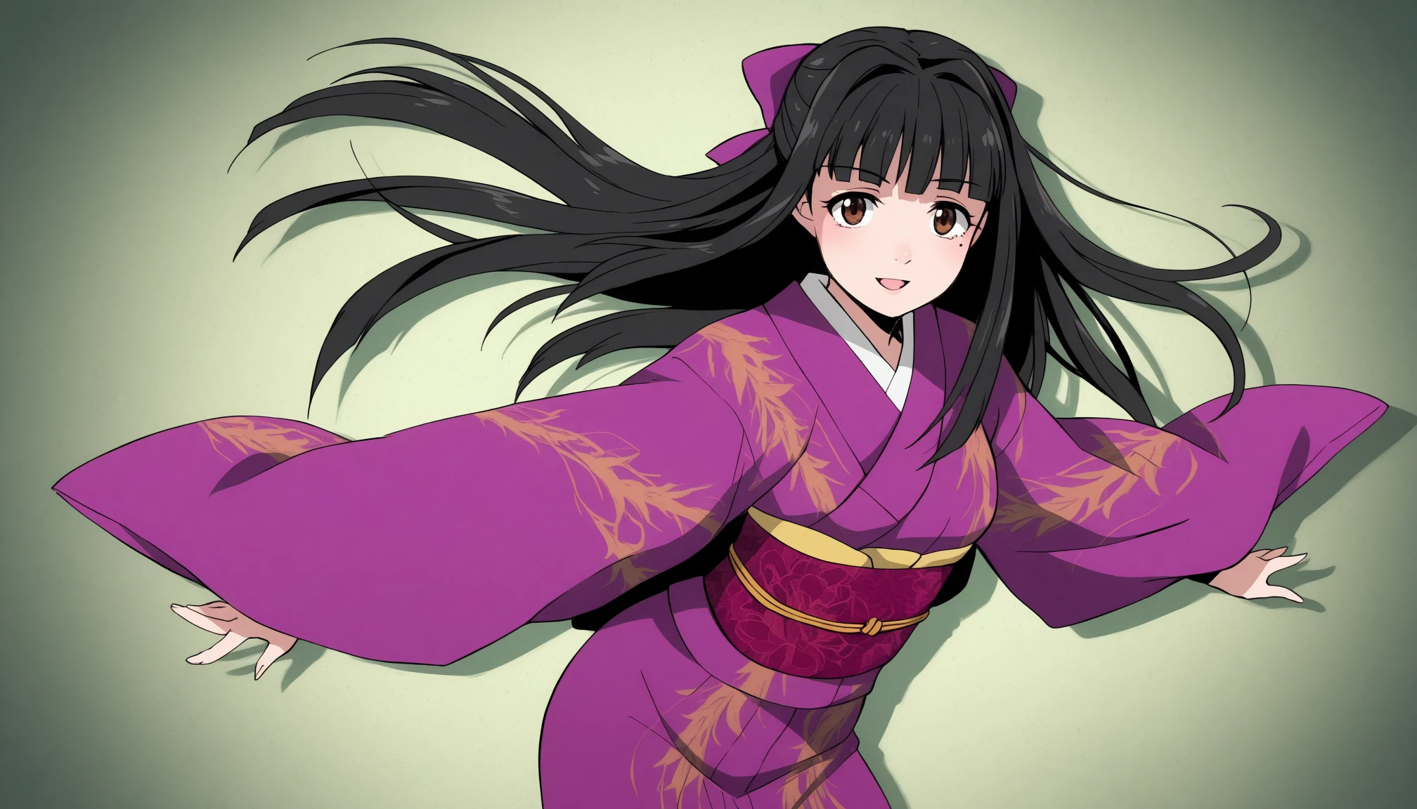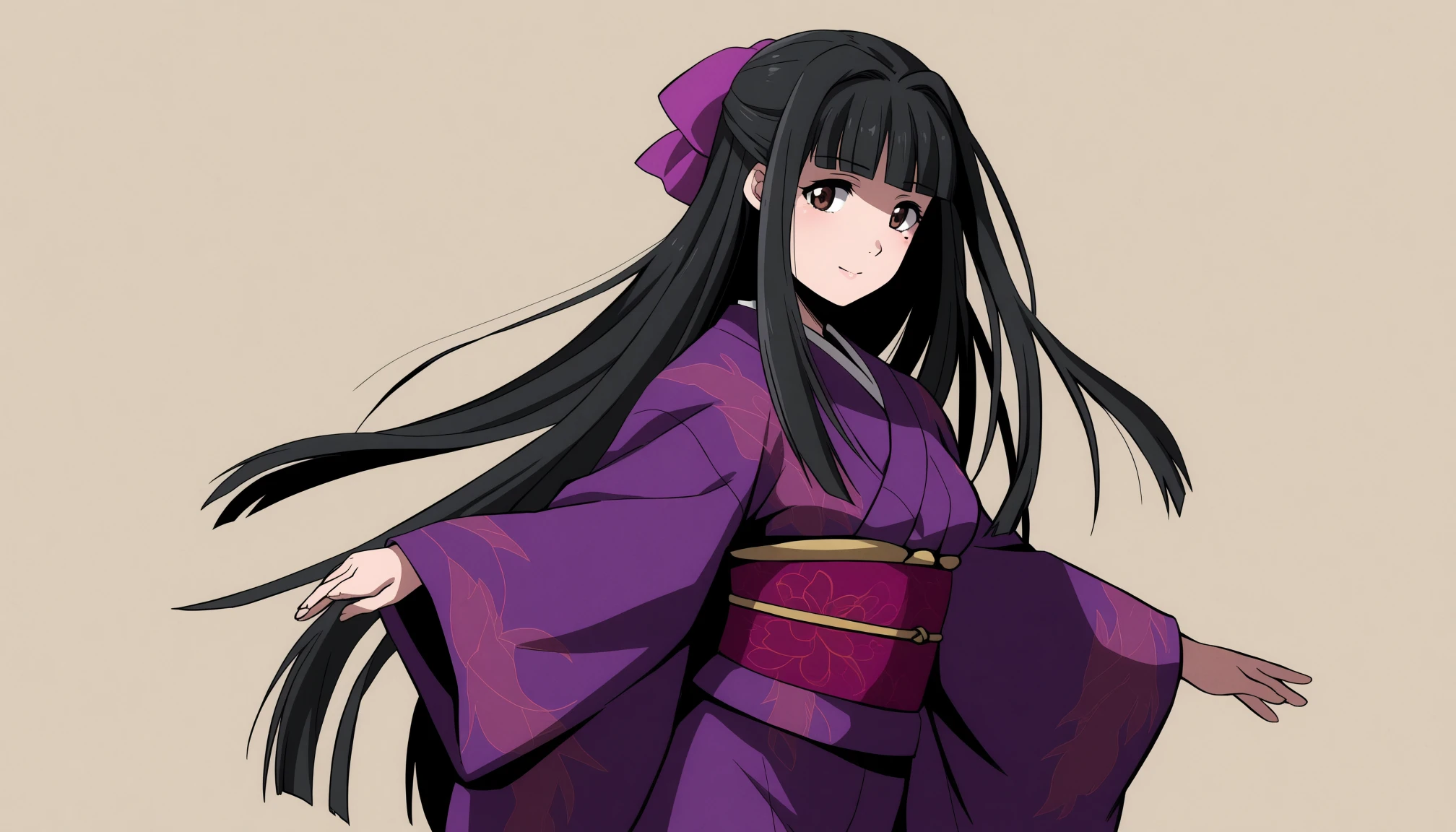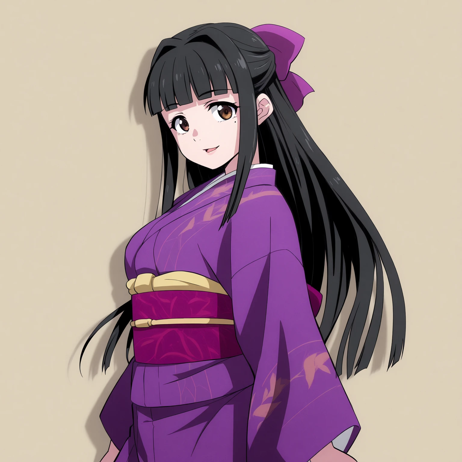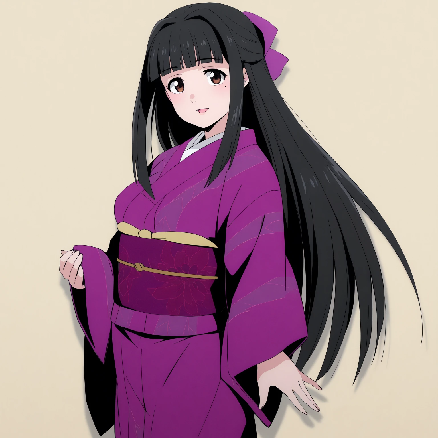 ryuuga sayo, 1girl, brown eyes, mole under eye, black hair, long hair, very long hair, blunt bangs, hime cut, hair intakes, half updo, long sidelocks, hair bow, purple bow, japanese clothes, kimono, multicolored kimono, purple kimono, obi, obiage, obijime