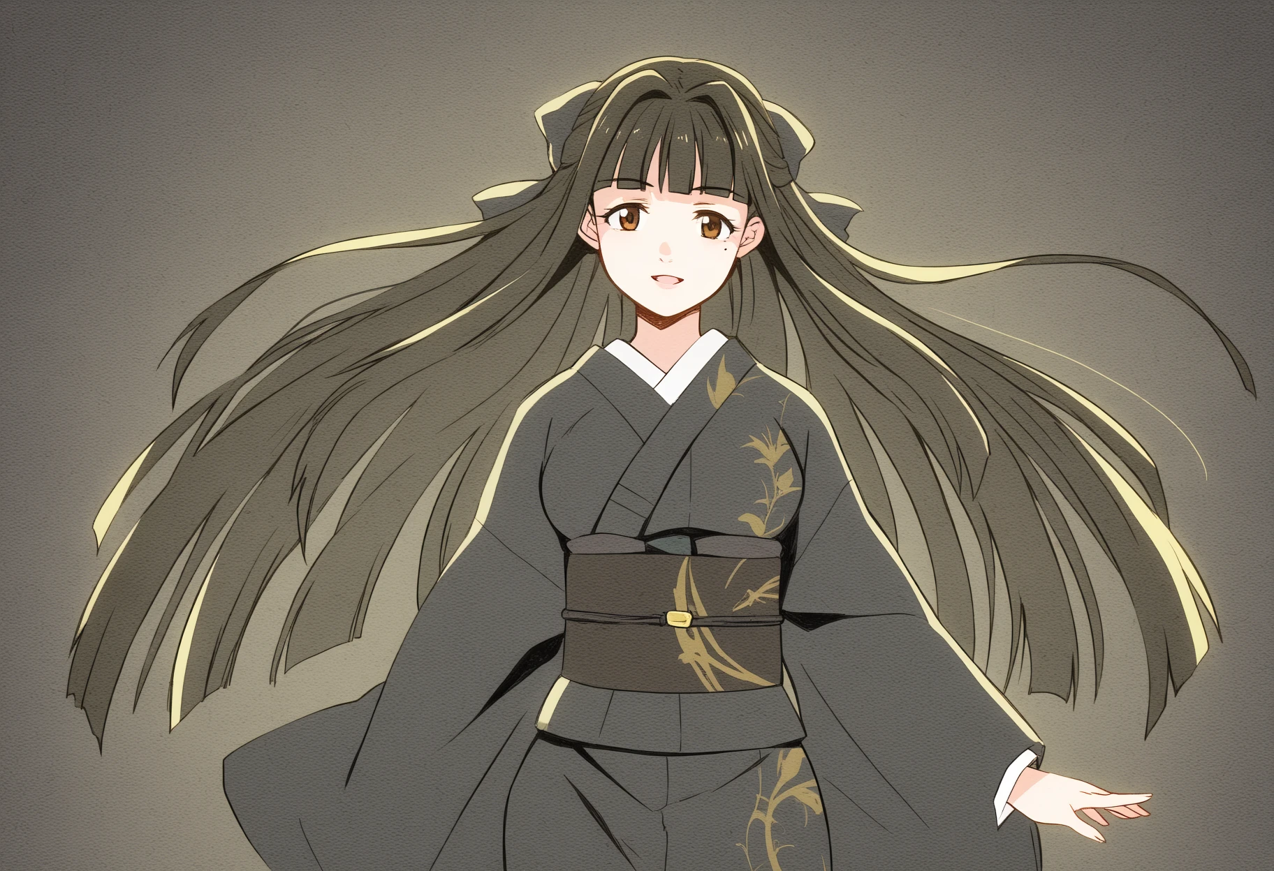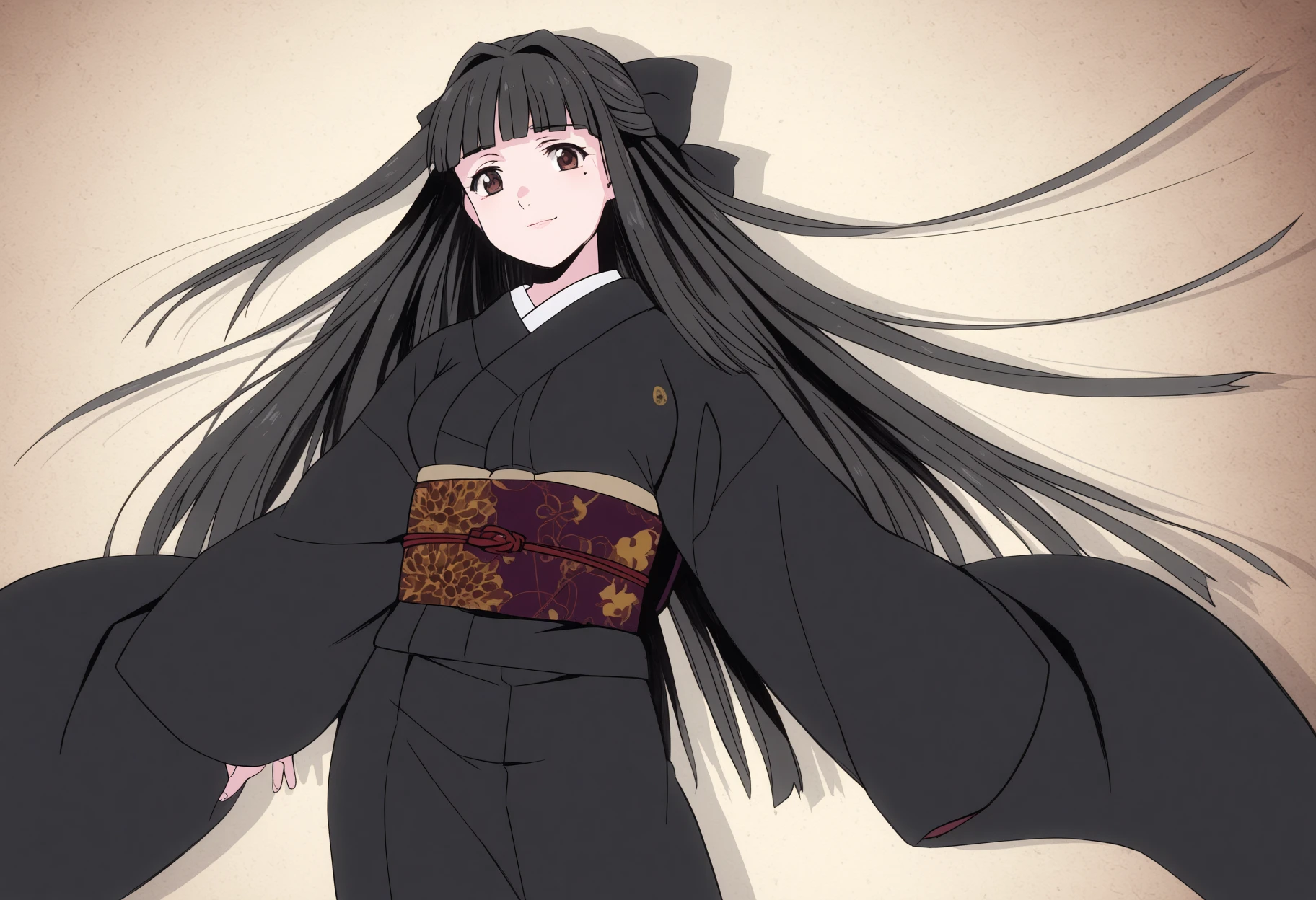 ryuuga sayo, 1girl, brown eyes, mole under eye, black hair, long hair, very long hair, blunt bangs, hime cut, hair intakes, half updo, long sidelocks, hair bow, black bow, japanese clothes, kimono, black kimono, obi, obiage, obijime