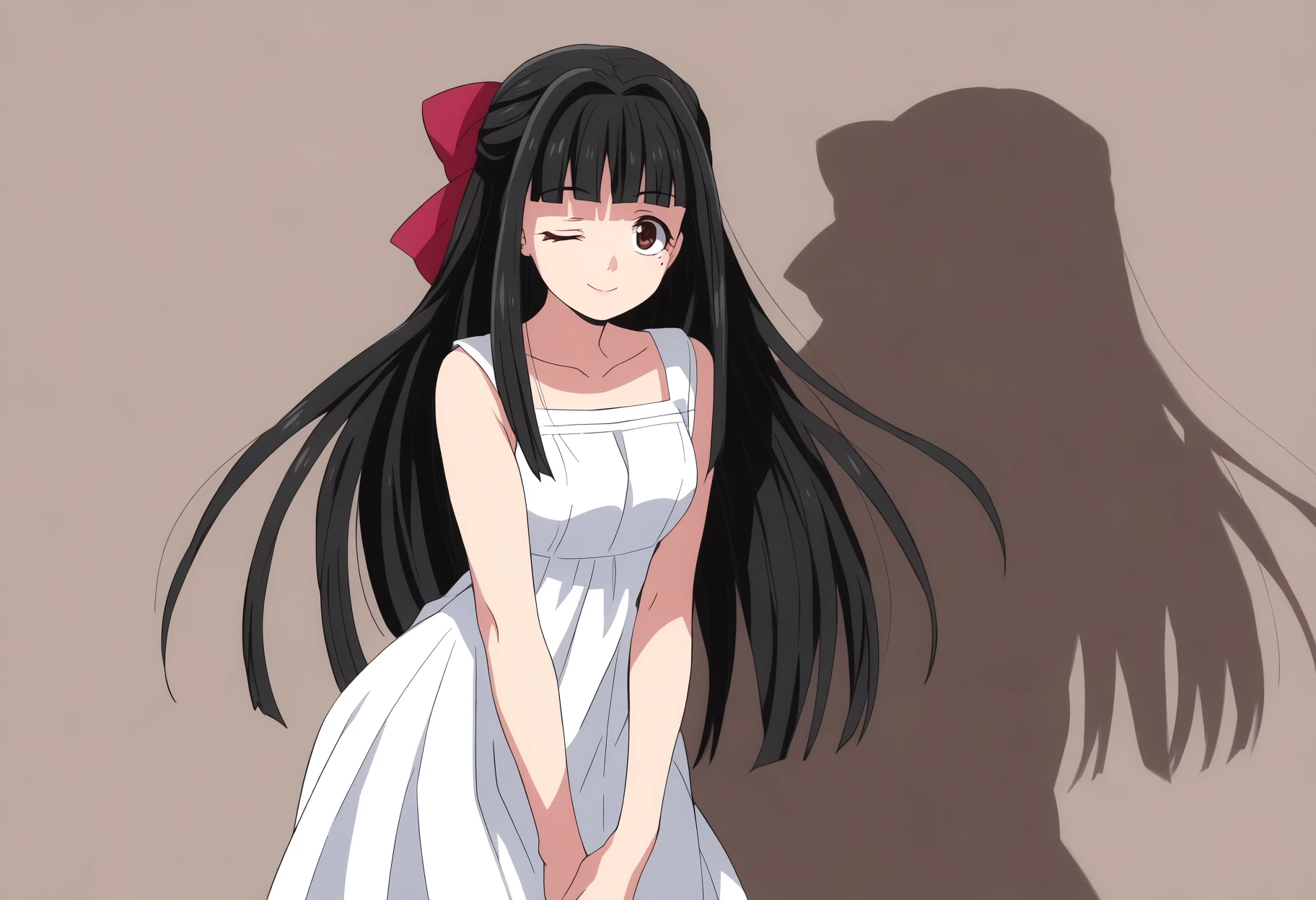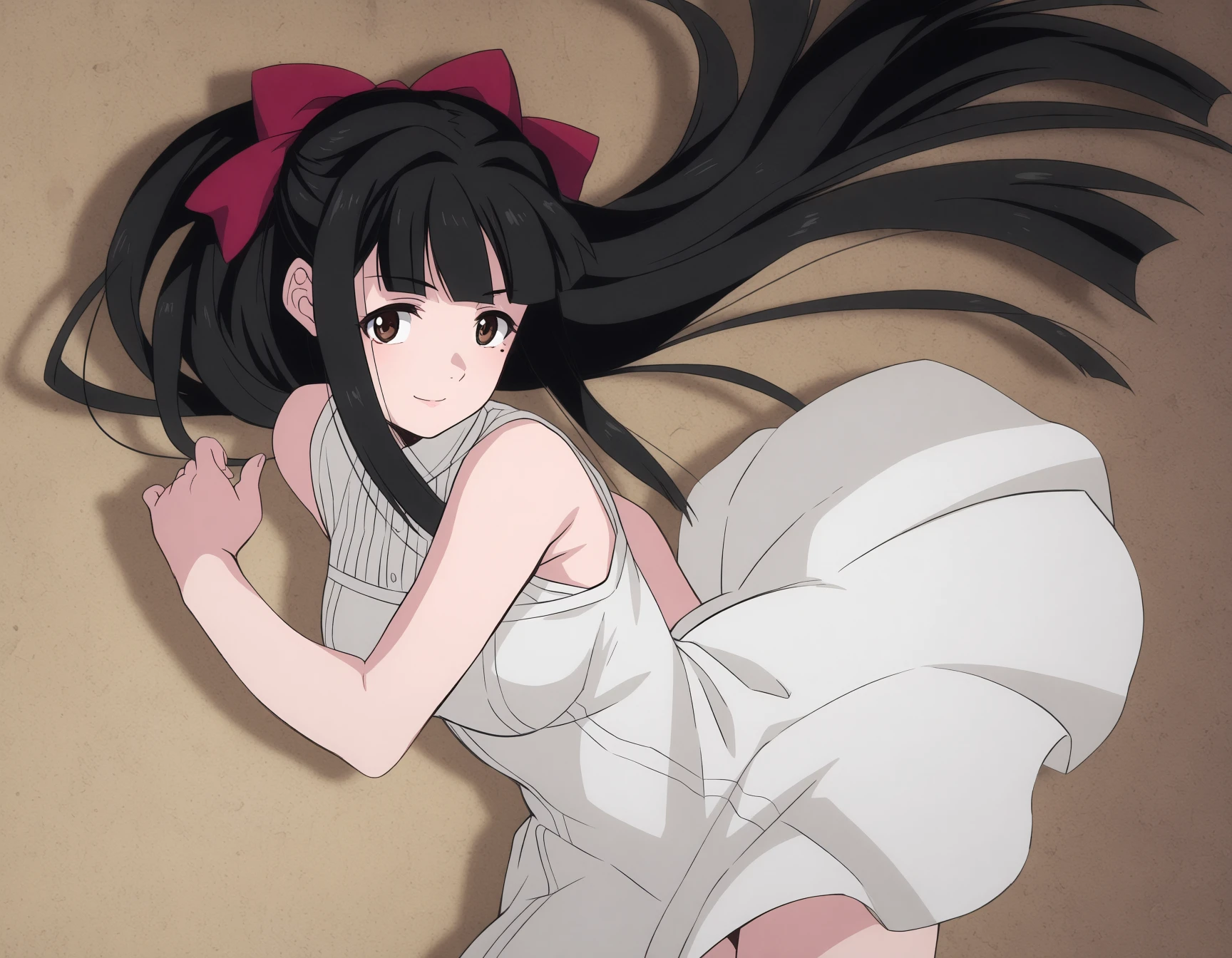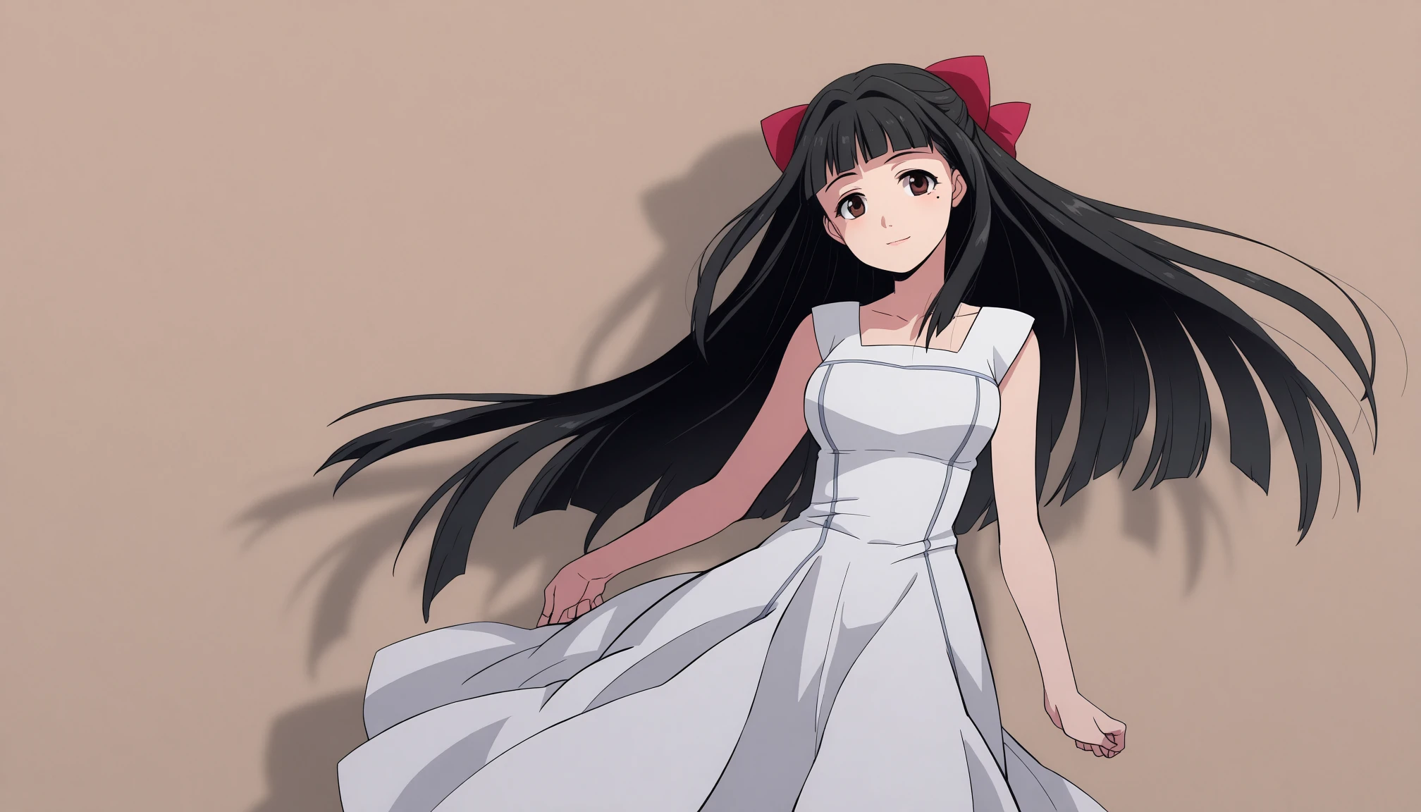 ryuuga sayo, 1girl, brown eyes, mole under eye, black hair, long hair, very long hair, blunt bangs, hime cut, hair intakes, half updo, long sidelocks, hair bow, red bow, dress, white dress, sleeveless dress, sleevelessDescription