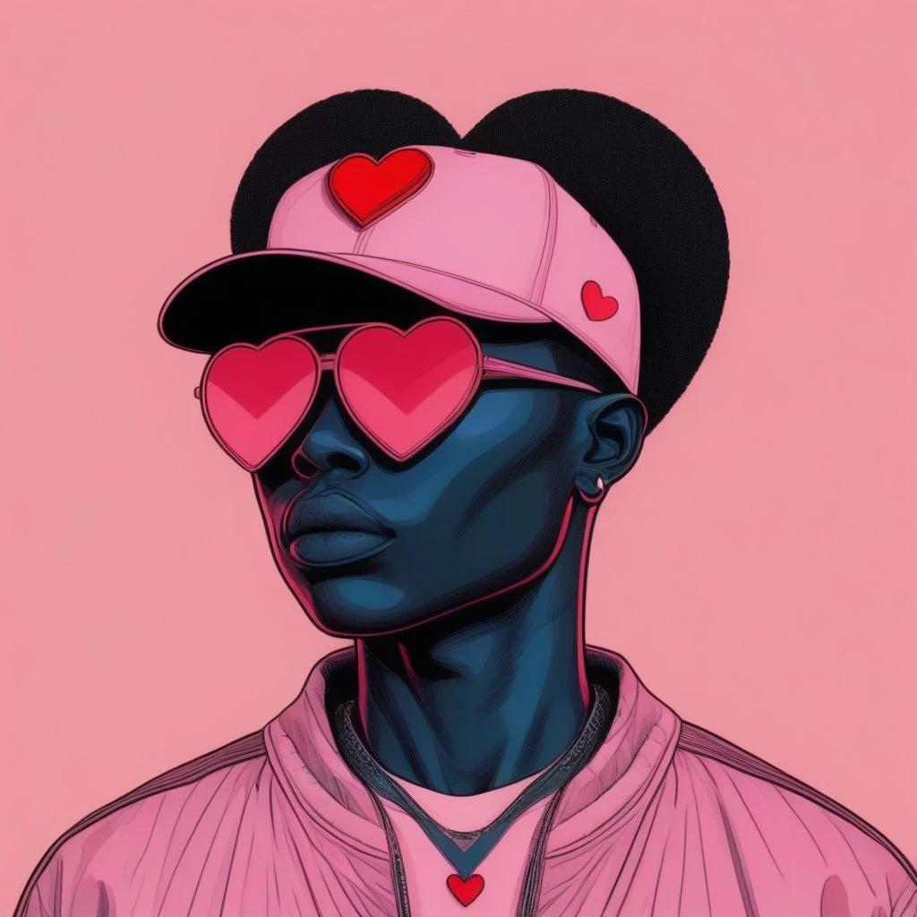 Example Prompt: <lora:blacklove:1> Black Love, Pop Art style portrait, individual, 1girl, dark skin, afro-textured hair, heart-shaped pink sunglasses, striped heart background, fitted baseball cap with a heart emblem, subtle patterns, cool and contemporary vibe, vibrant and striking, trending on ArtStation.