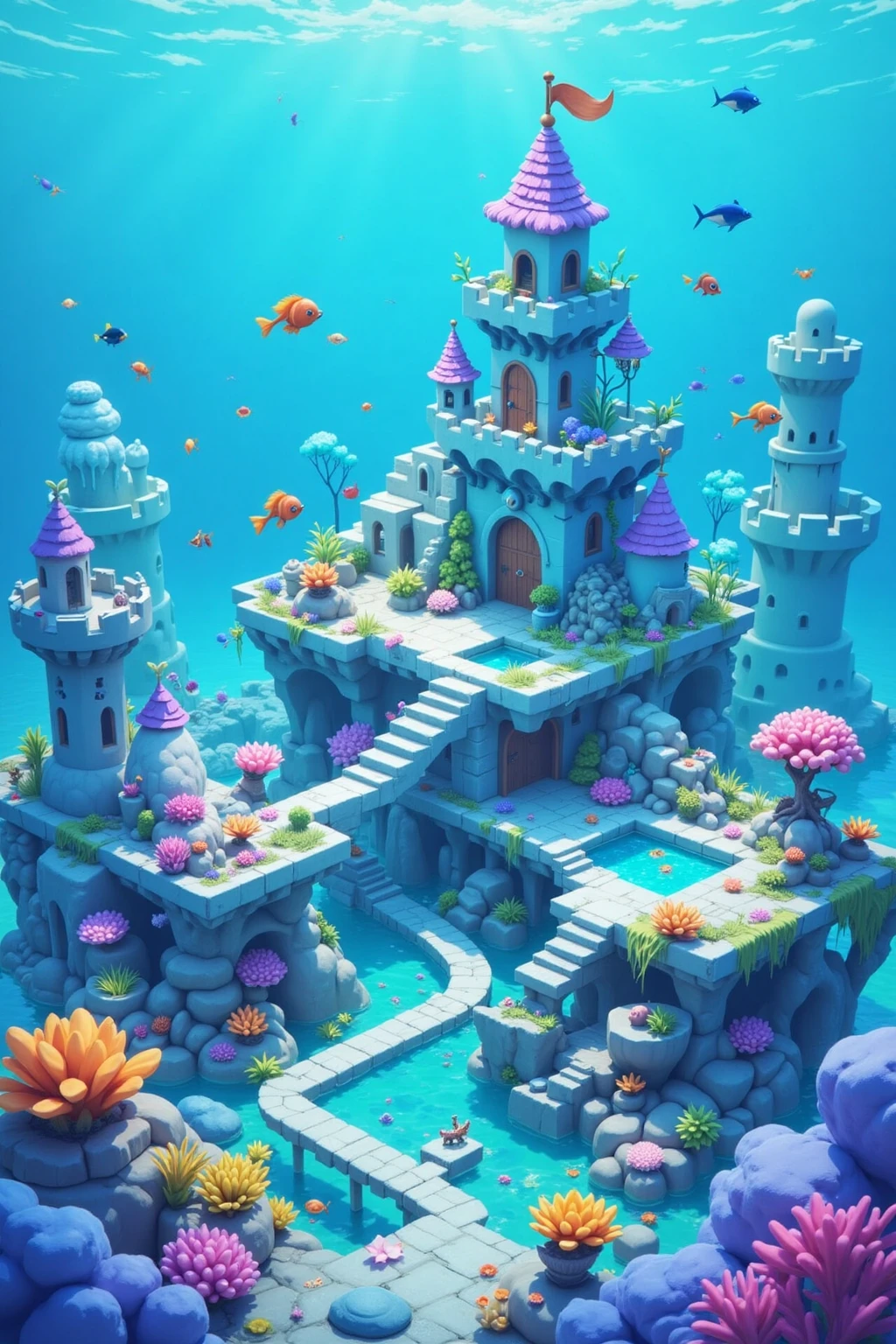 Fantasy 3D game scene style, an underwater kingdom, coral - made castles, mermaid palaces, schools of colorful fish swimming around.