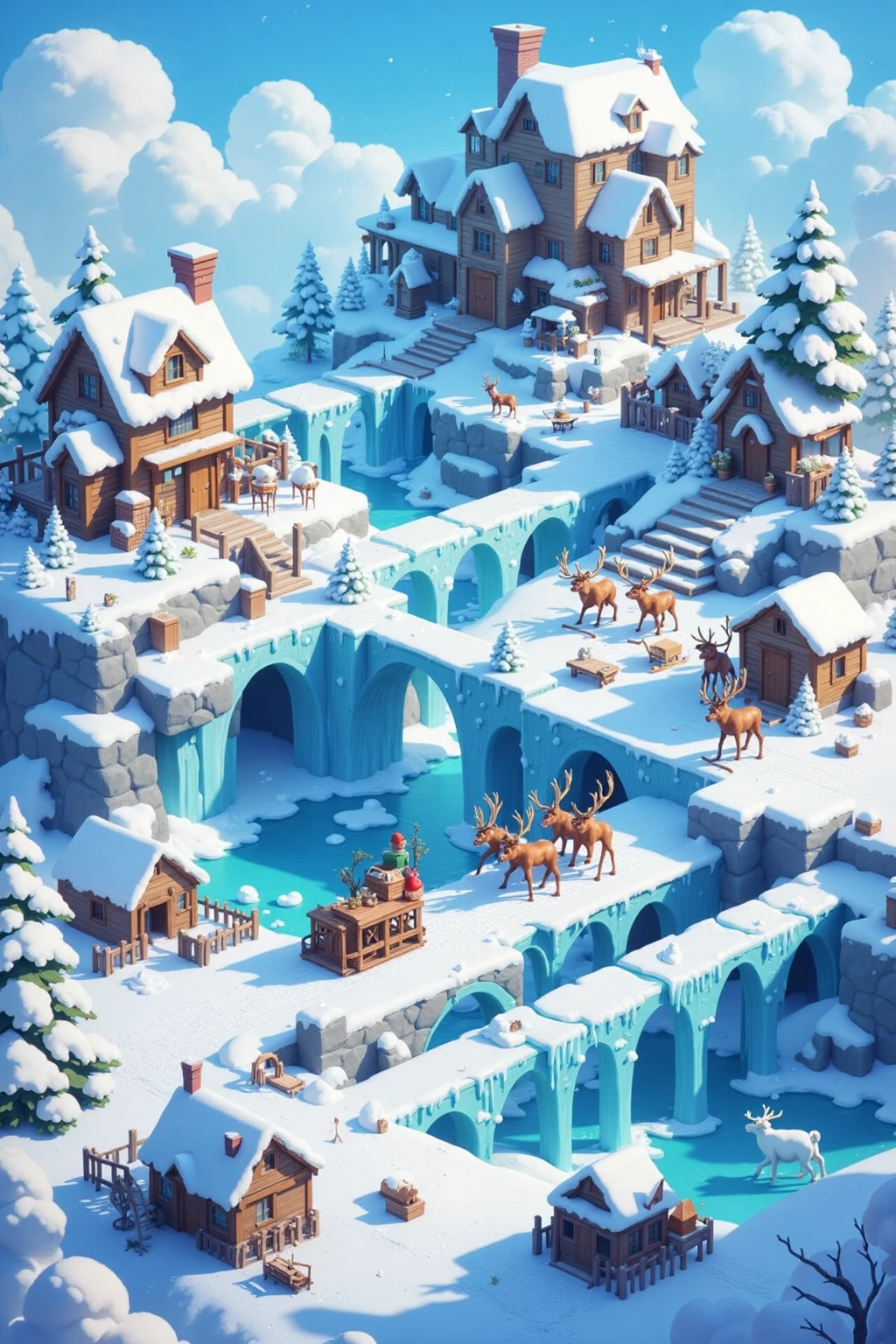 Fantasy 3D game scene style, a winter wonderland town, snow - covered cottages, ice - sculpture bridges, reindeer pulling sleds.