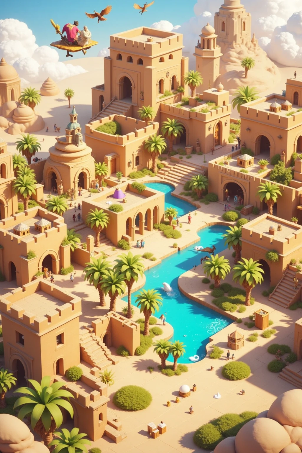 Fantasy 3D game scene style, a desert oasis city, sandstone towers, palm - lined canals, magic carpets flying above.
