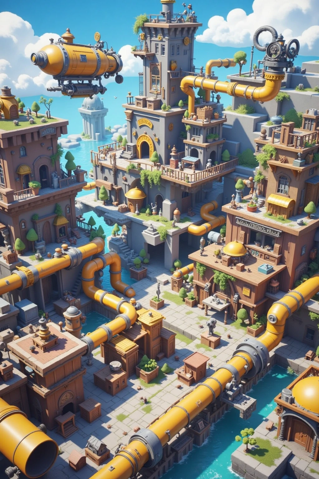 Fantasy 3D game scene style, a steampunk - themed town, gears and pipes everywhere, airships flying in the sky, brass - colored buildings.