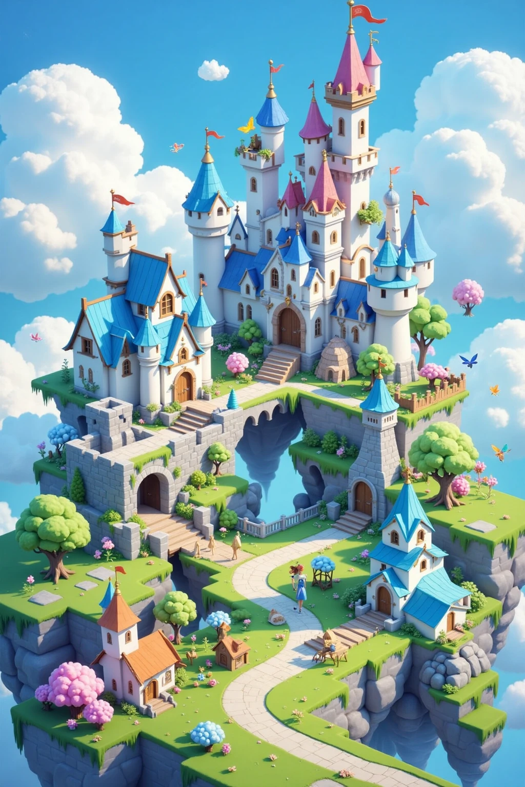 Fantasy 3D game scene style, a fairy - tale castle realm, grand castles with spires, flower - filled gardens, fairies fluttering about.