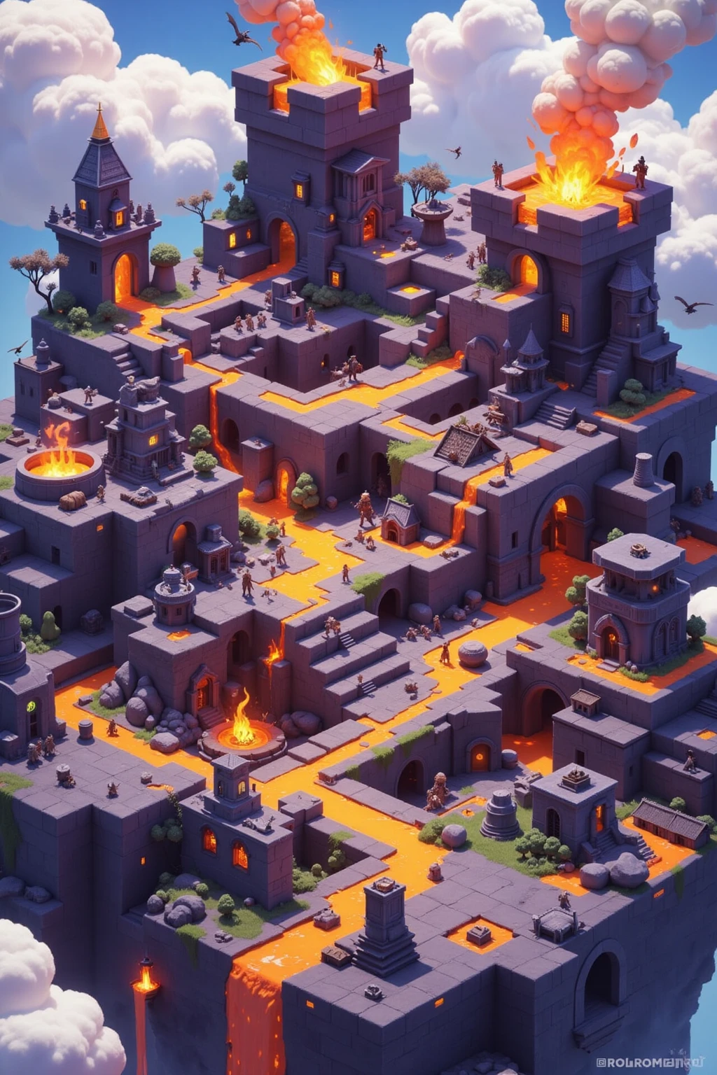 Fantasy 3D game scene style, a volcanic island city, lava rivers as roads, obsidian buildings, fire - breathing dragons in the sky.