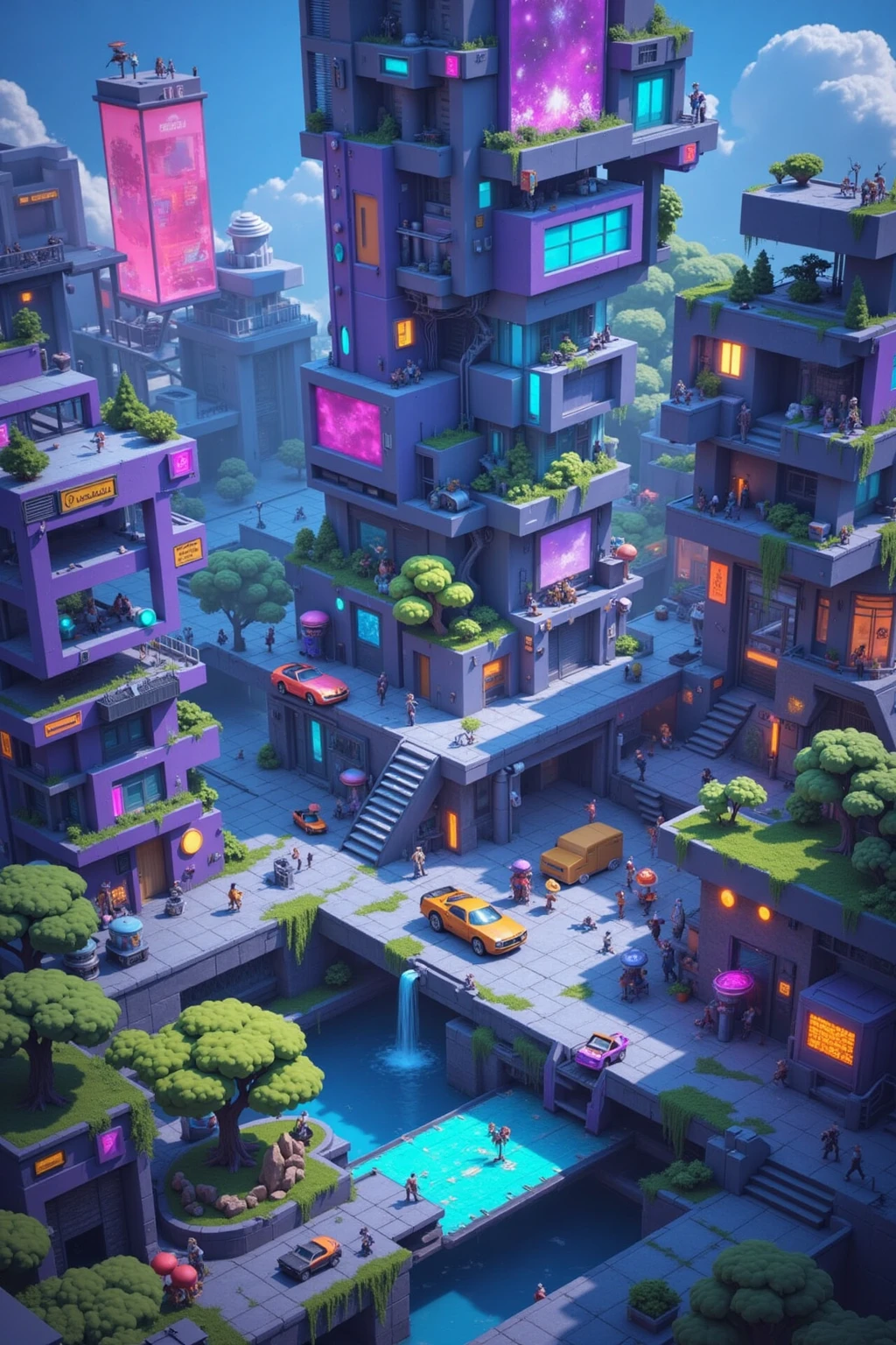 Fantasy 3D game scene style, a cyber - fantasy city, neon - lit skyscrapers, hovercars, robot - tended parks.