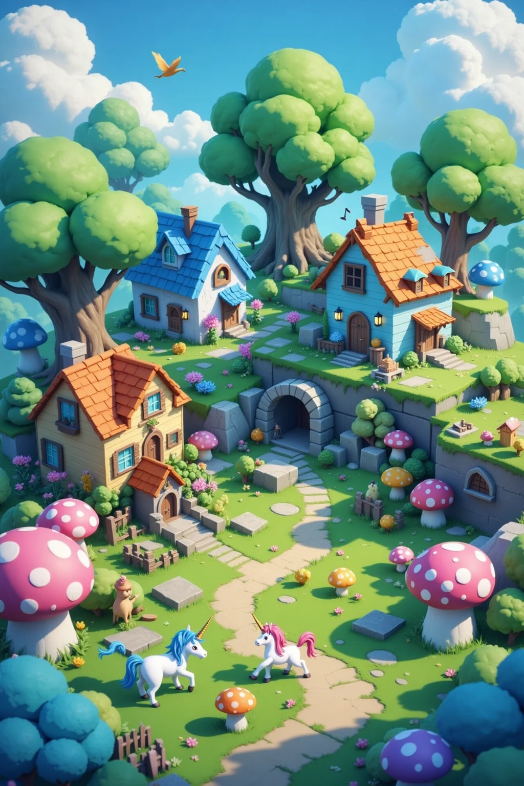 Fantasy 3D game scene style, a magic forest village, tree - house homes, glowing mushrooms, unicorns grazing on the grass.