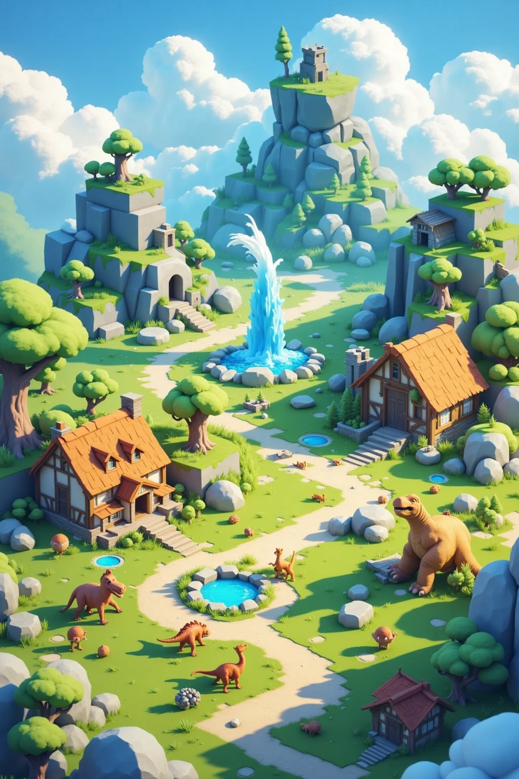 Fantasy 3D game scene style, a dinosaur - era valley, prehistoric huts, geysers erupting, dinosaurs roaming the land.