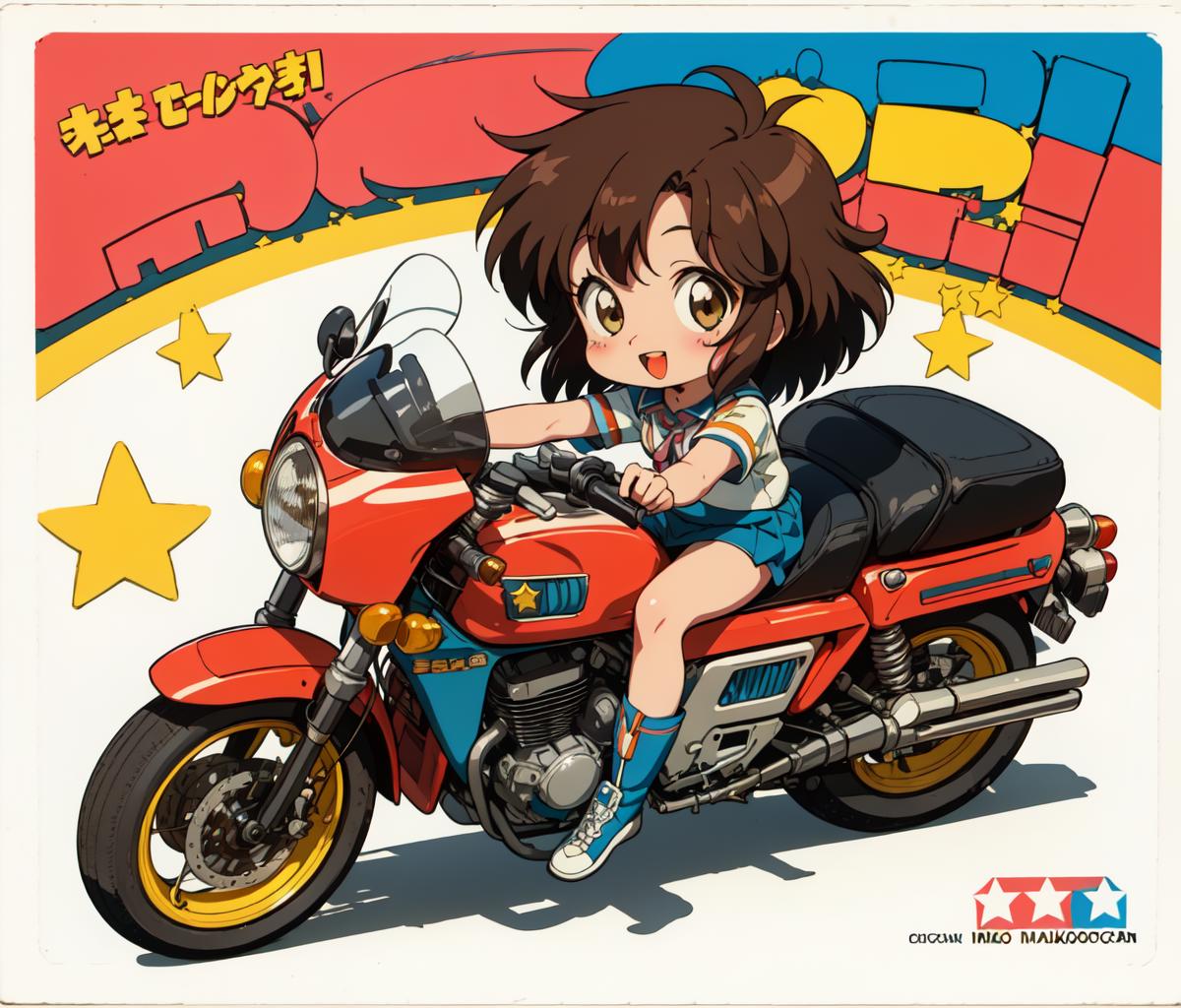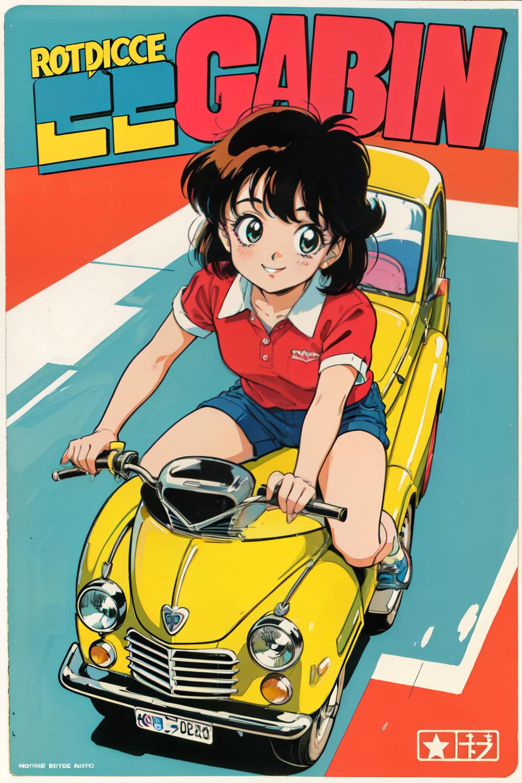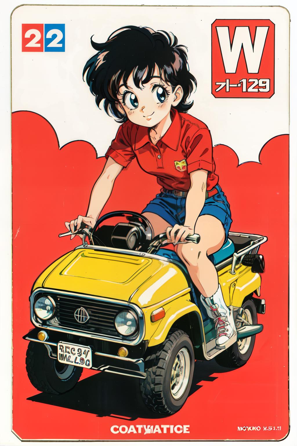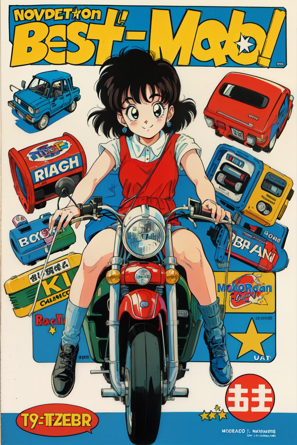 1980s \(style\),retro artstyle,toy box art,logo,riding ground vehicle,
