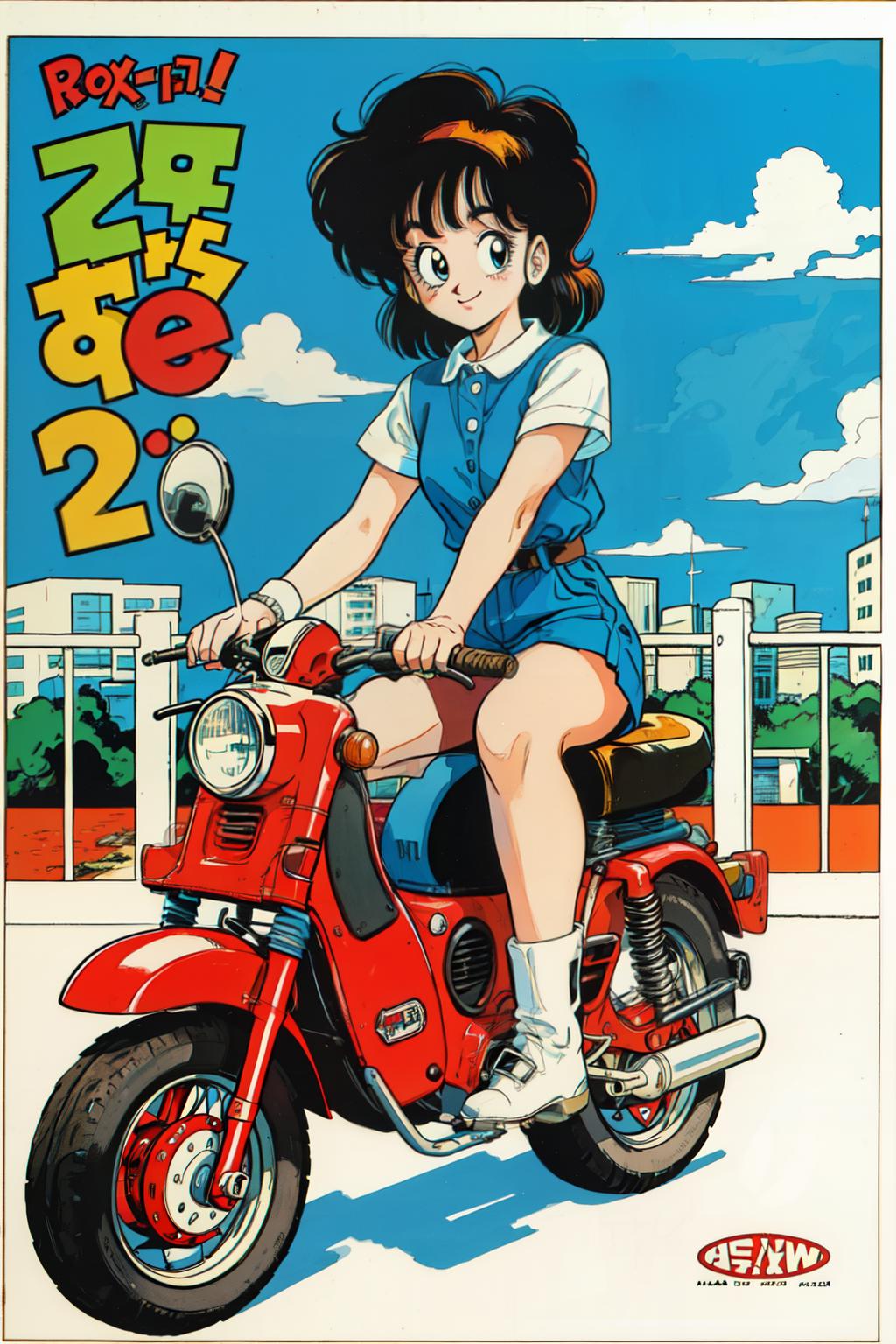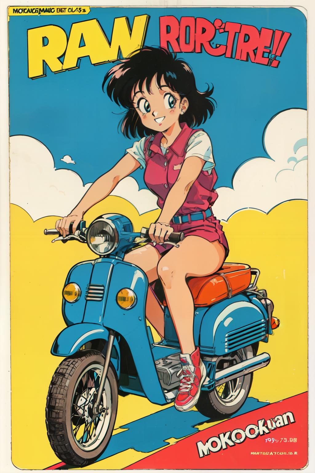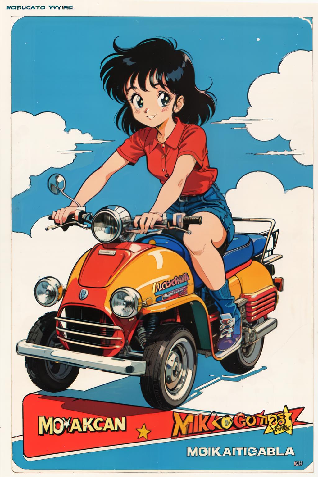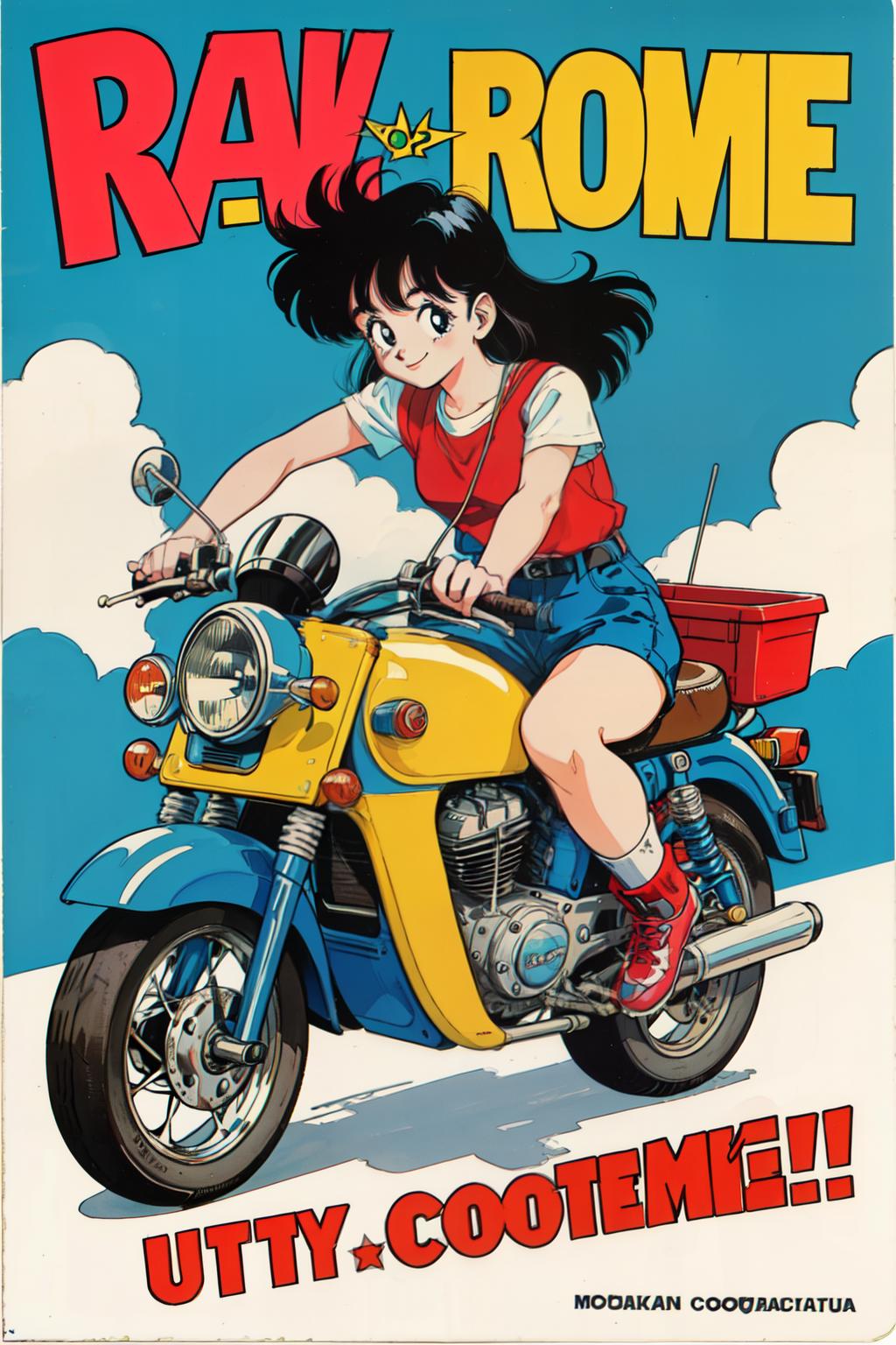 1980s \(style\),retro artstyle,toy box art,logo,riding ground vehicle,