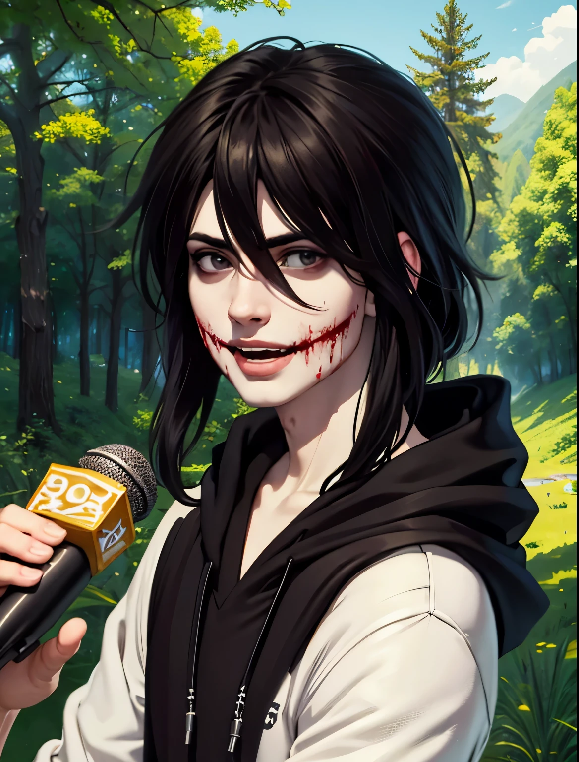jeff, 1boy, hoodie, smile, blood on face, open mouth, long sleeves, hair between eyes, black hair, medium hair, scar in mouth, male focus, pale skin, blood from mouth