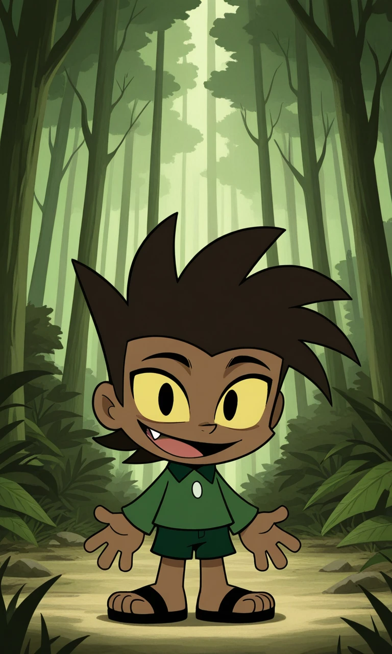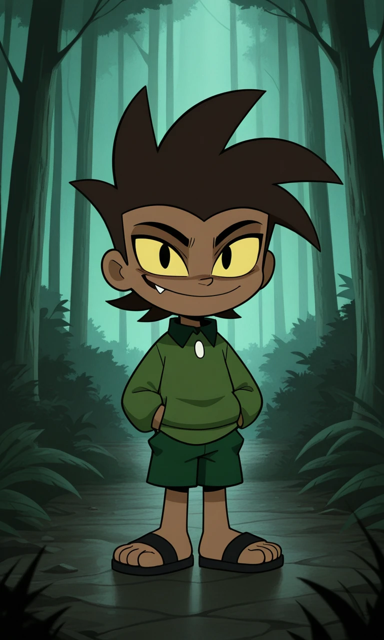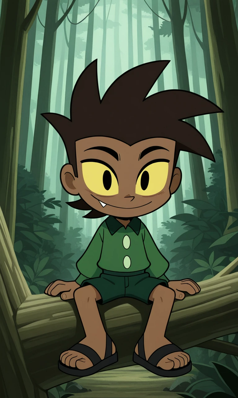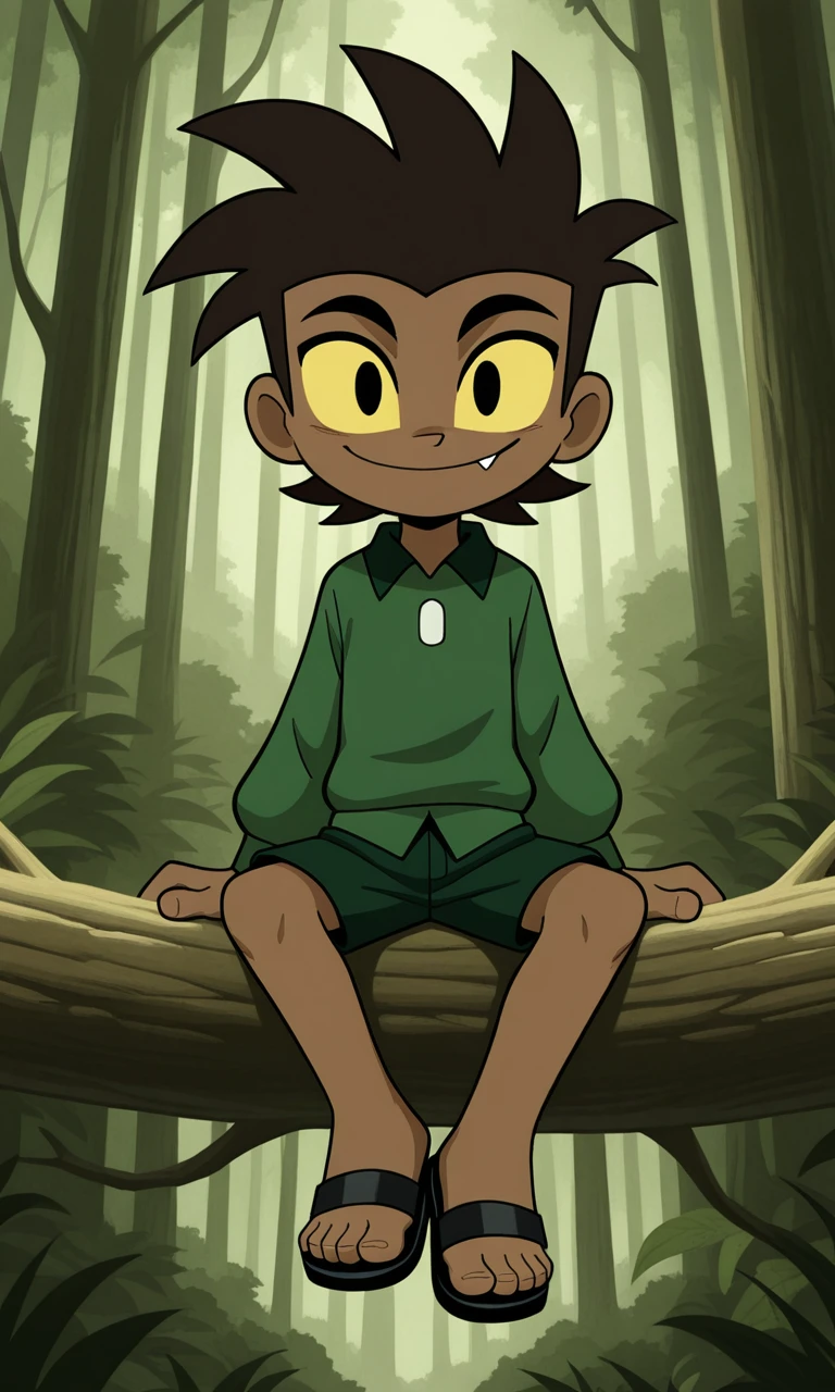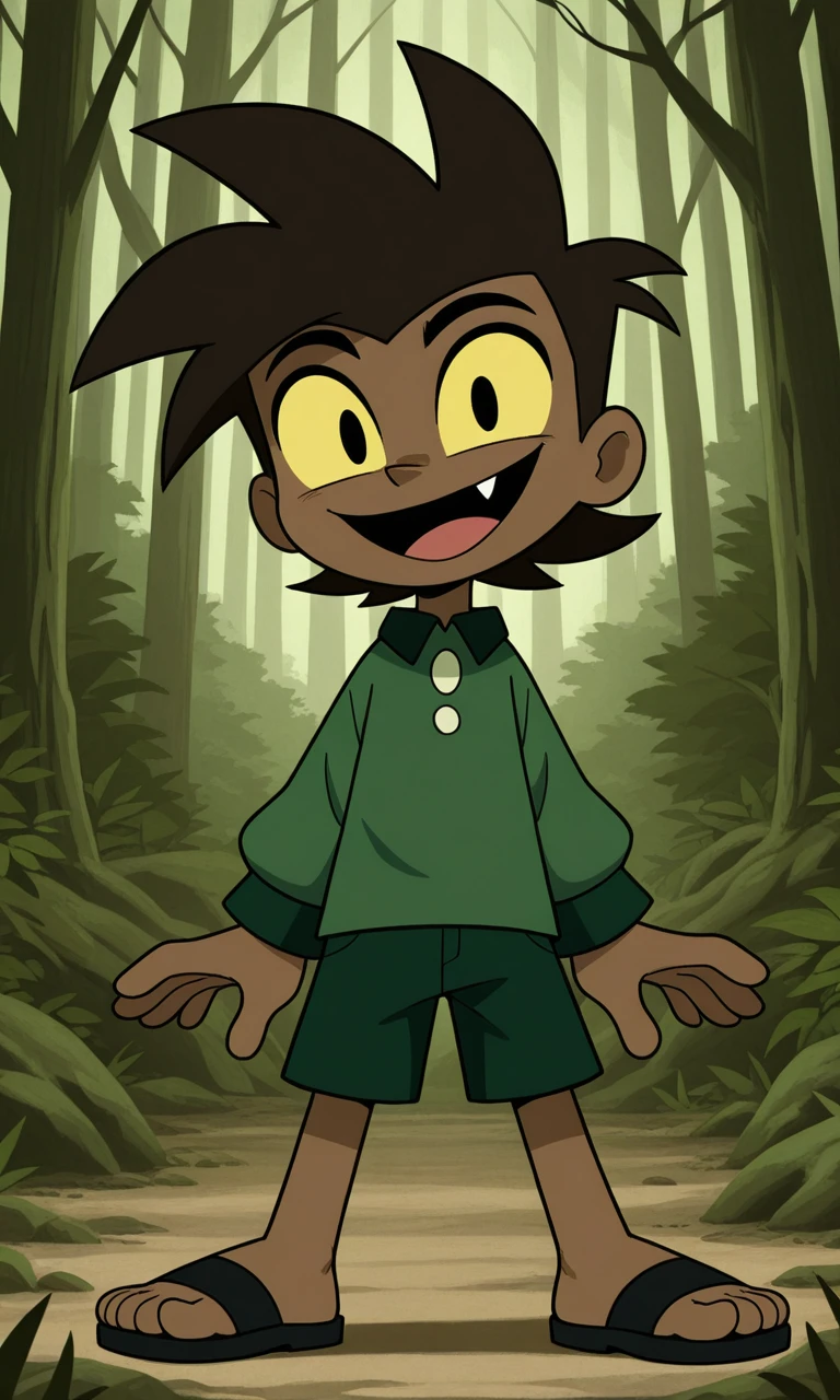 LonWlf, 1boy, dark brown hair, brown skin, yellow sclera, black eyes, fang