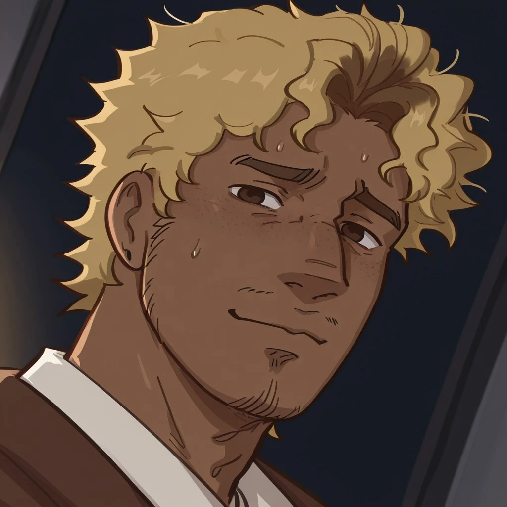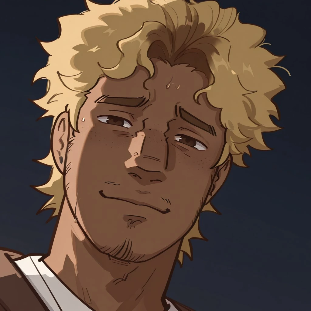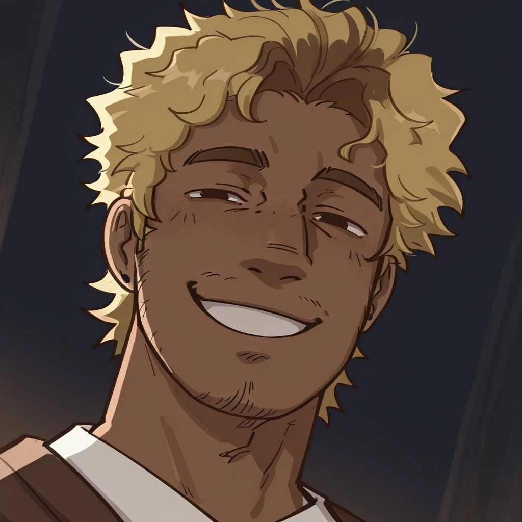 JeremyFNAF, brown skin, blonde hair, brown roots, facial hair, buff, male