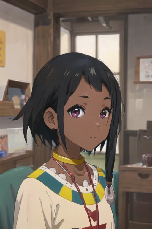 Trigger Words: mochimazzi choi, black hair, dark skin, dark-skinned female, short hair, magenta eyes