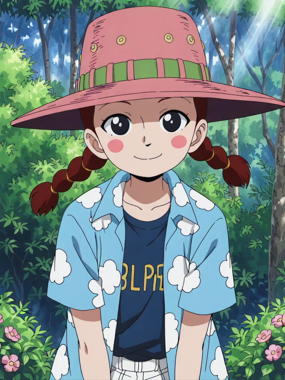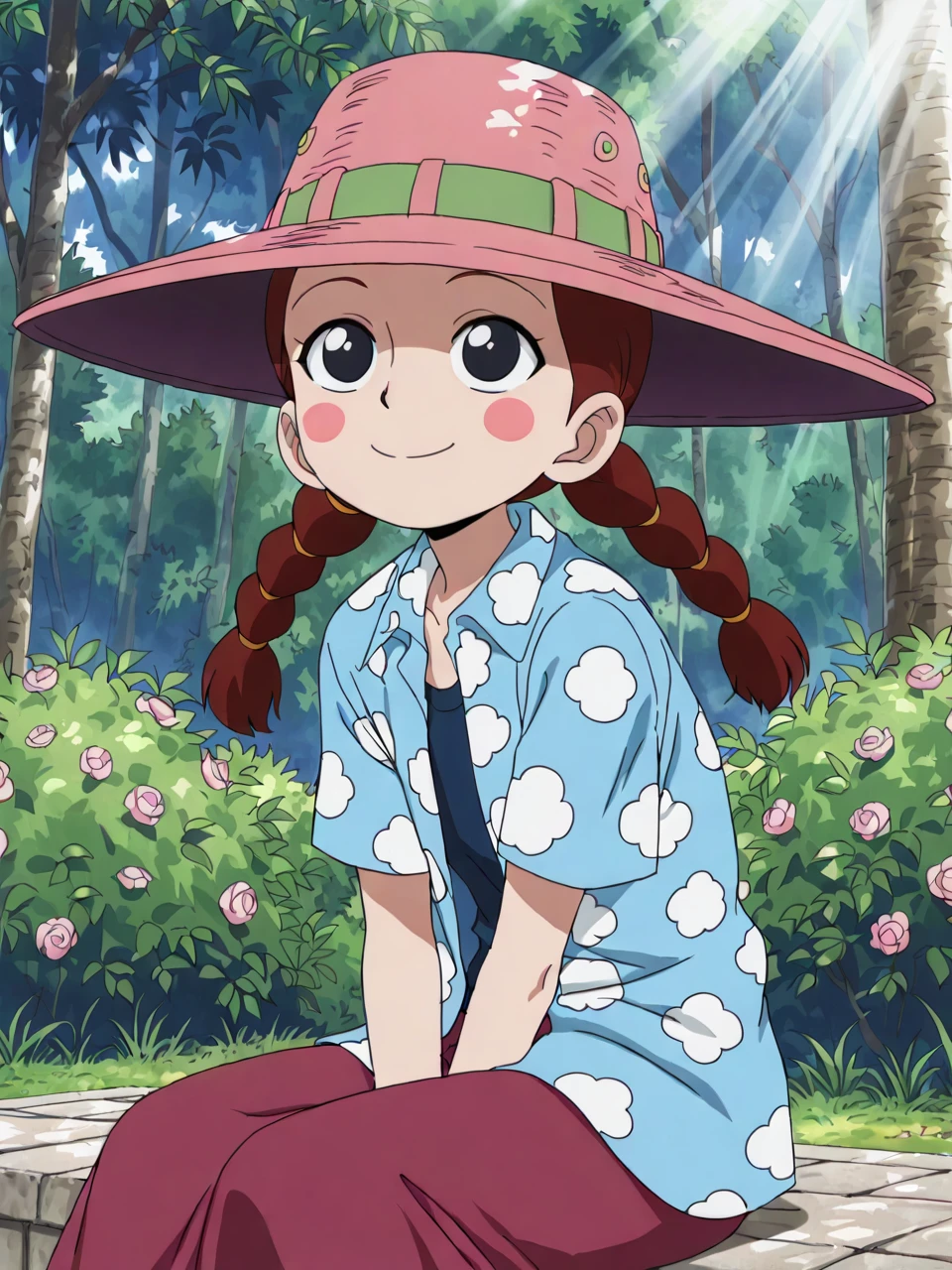 M4r14nn3, solo, 1girl, black eyes, brown hair, twin braids, blush stickers, pink headwear,