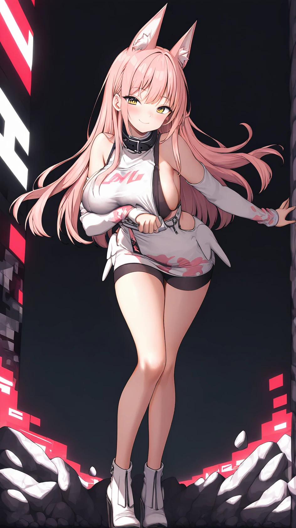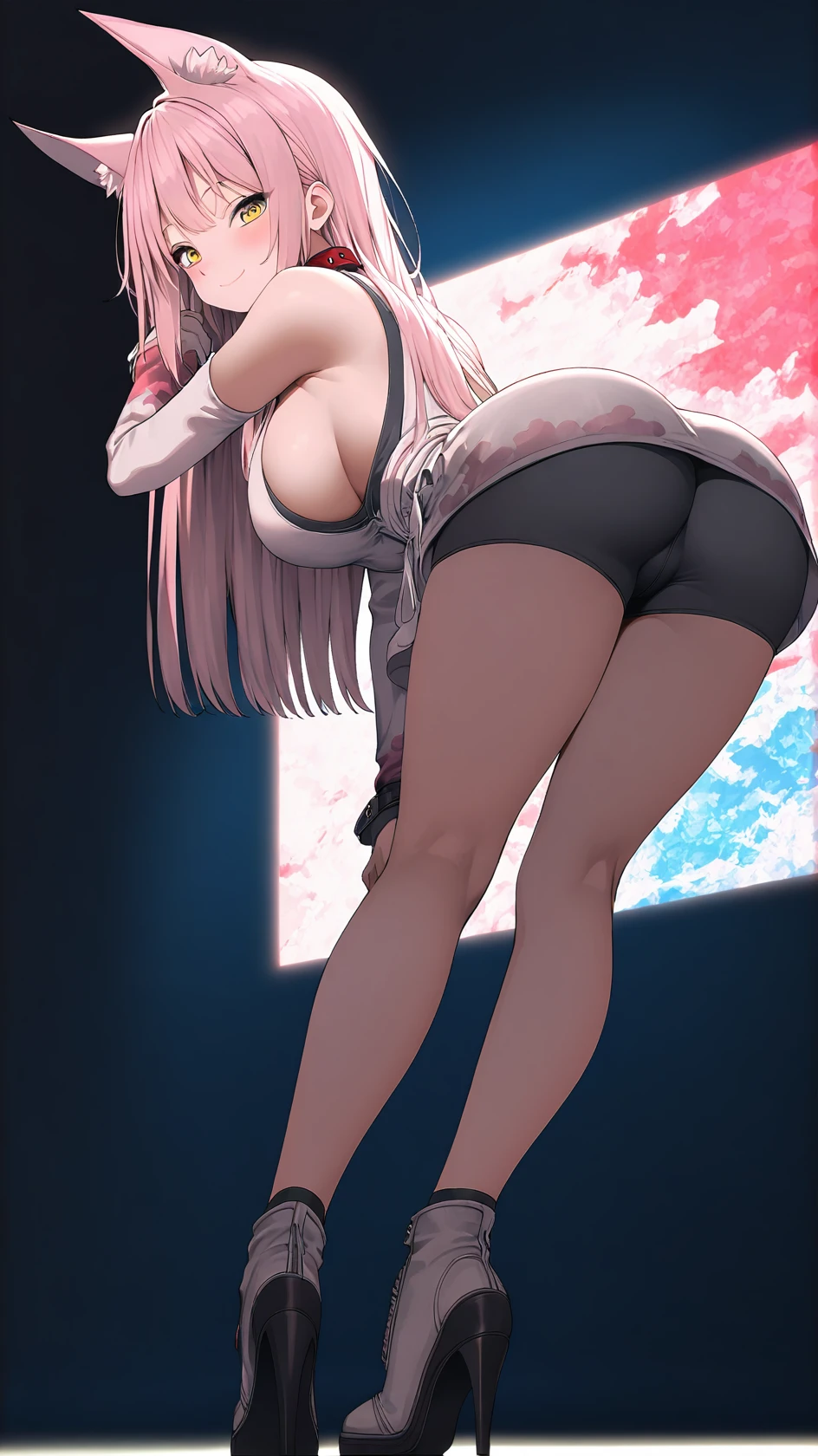Example prompt : 1girl, long hair, breasts, blush, bangs, large breasts, gloves,, dress, animal ears, bare shoulders, yellow eyes, pink hair, detached sleeves, shorts, sleeveless, white dress, high heels, collar, animal ear fluff, sideboob, white footwear, rabbit tail,