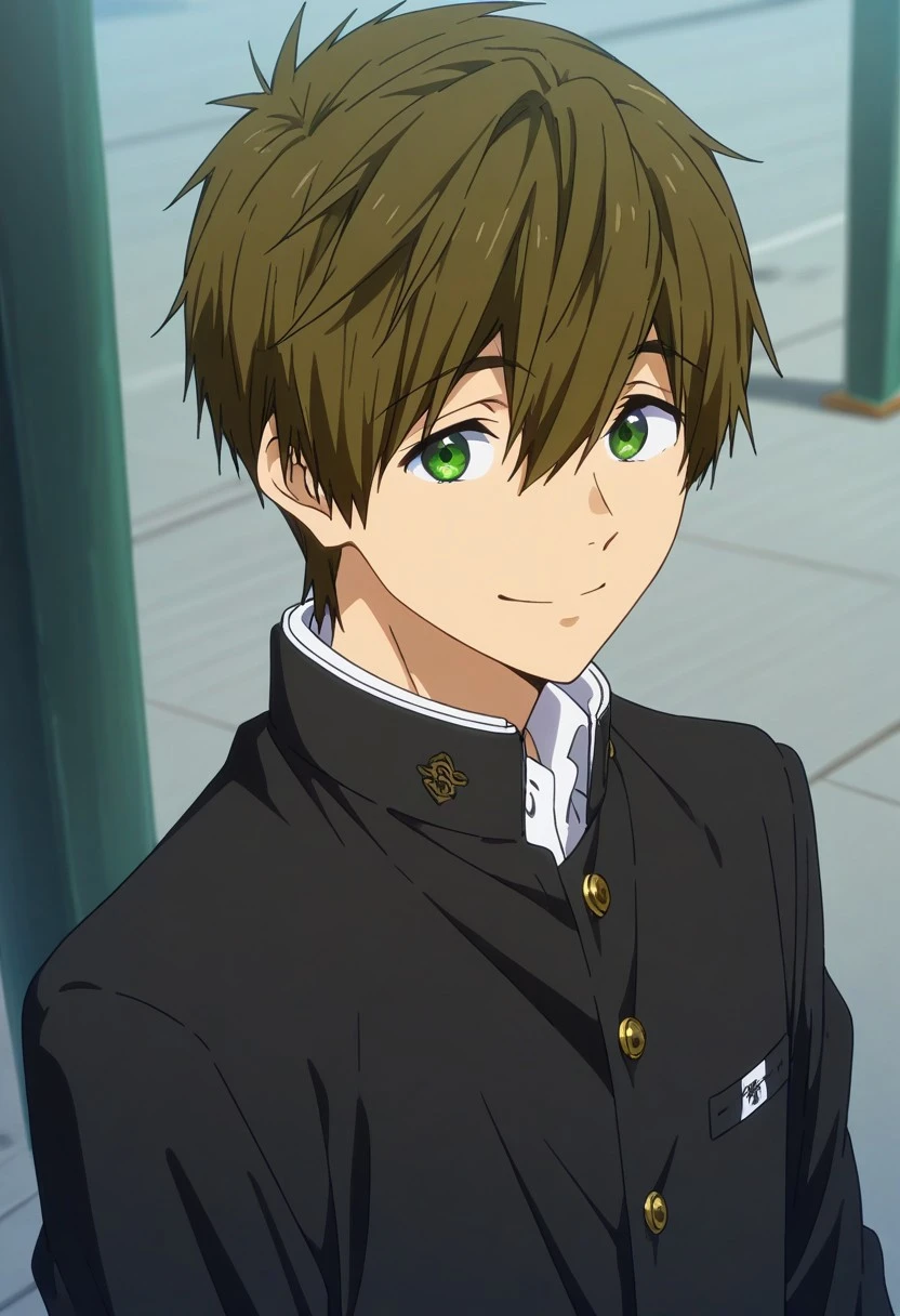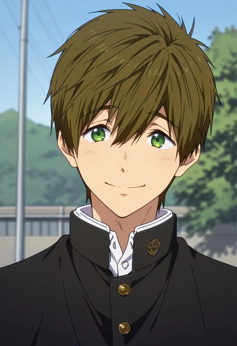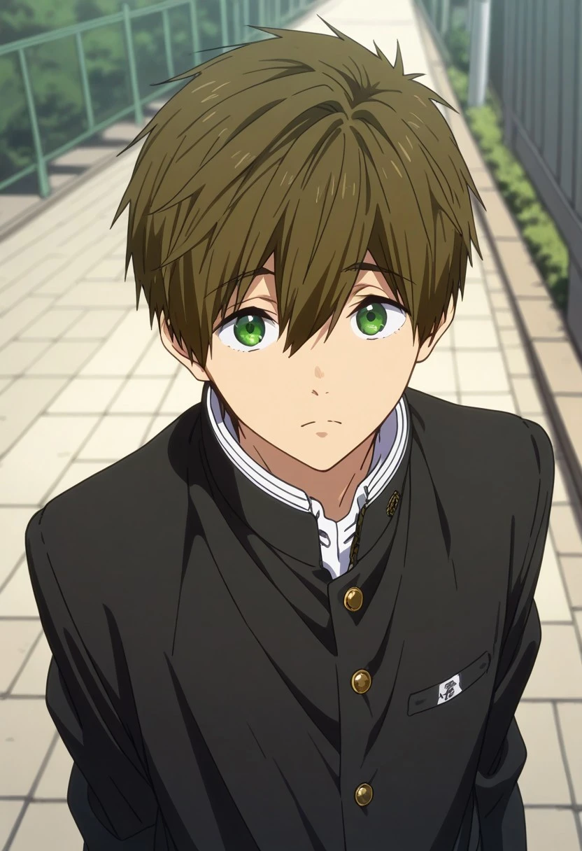 makostart, 1boy, male focus, solo, brown hair, hair between eyes, green eyes, school uniform, gakuran, jacket, black jacket, pants, black pants, shoes, sneackers, blue footwear,