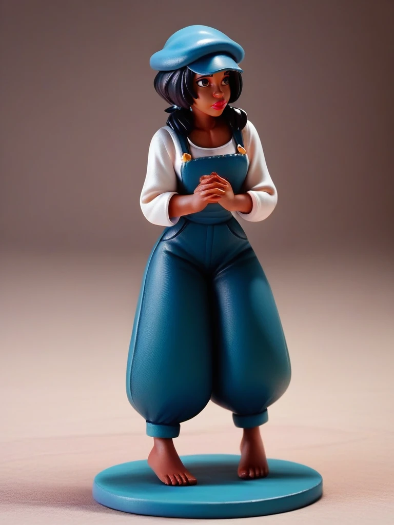 -"black hair, short hair, hat, blue overalls, white shirt, lipstick, dark skin"