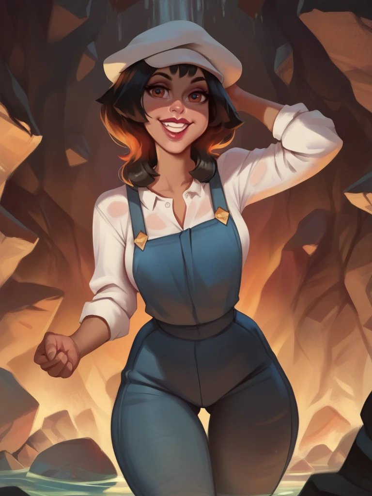 ,black hair, short hair, hat, blue overalls, white shirt, lipstick, dark skin,,