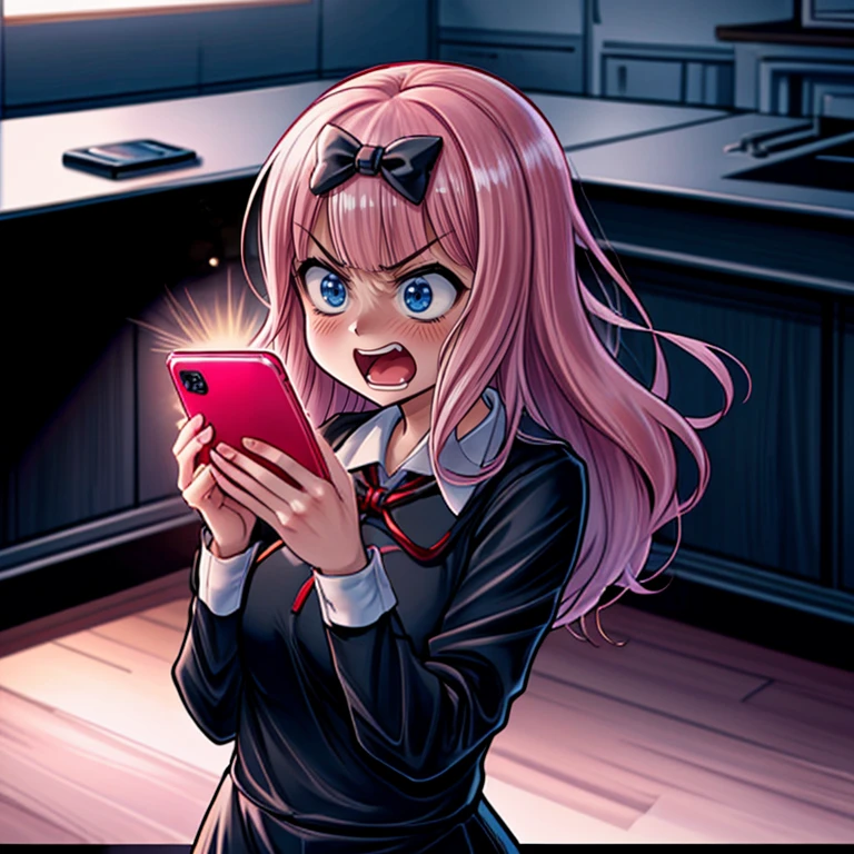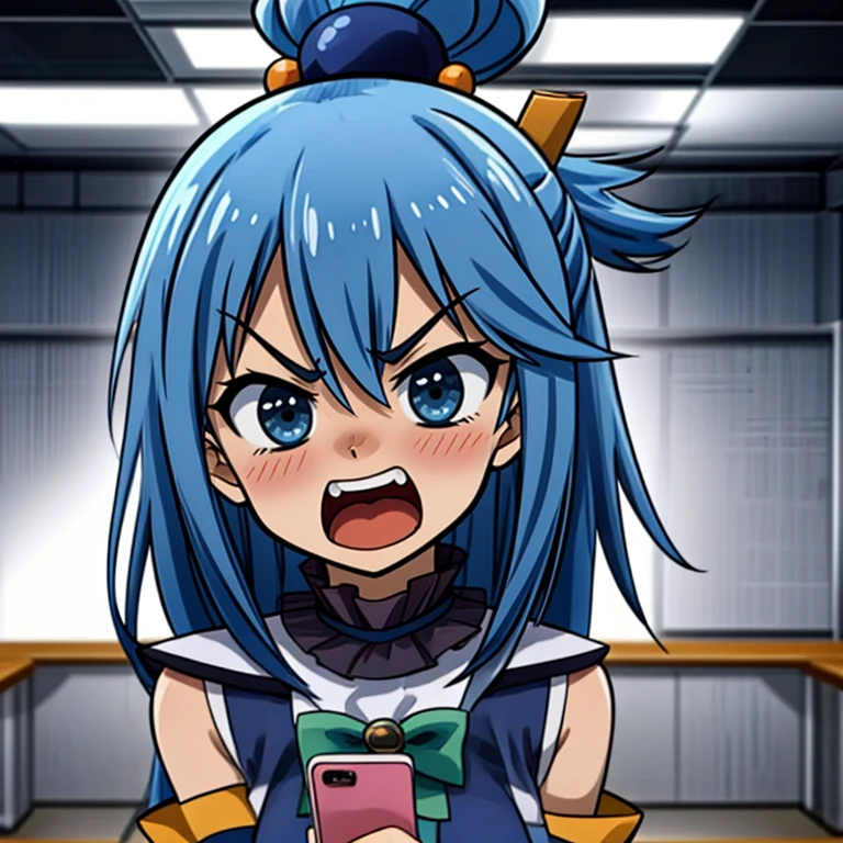 phone,indoors,blush,(((office,office interior,angry,holding phone,shouting,talking on phone,looking at phone))),
