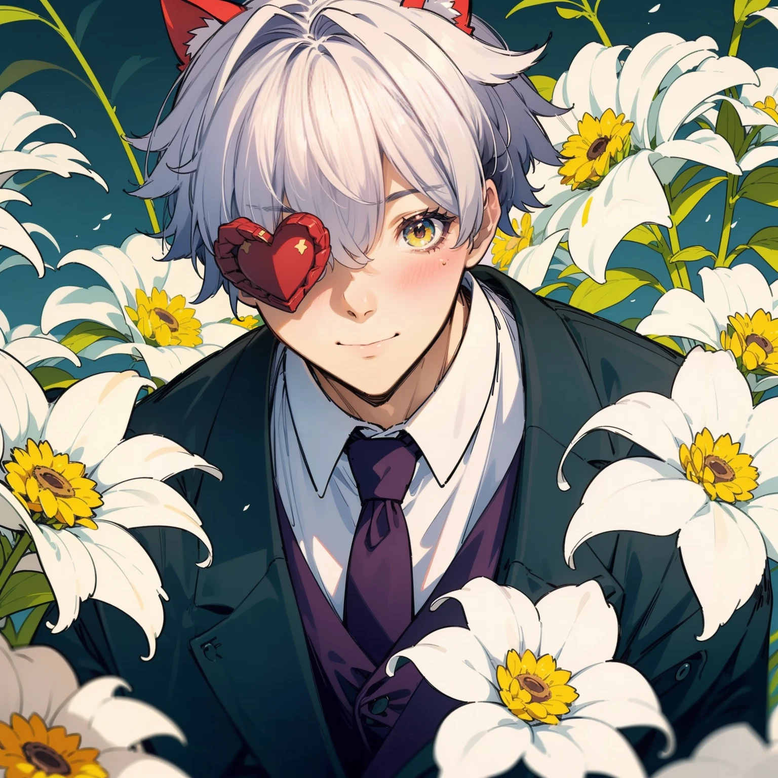 Asuka R Kreutz, guilty gear, flower over one eye, ((white hair)), yellow eye, purple tie, green suit, red cat ears