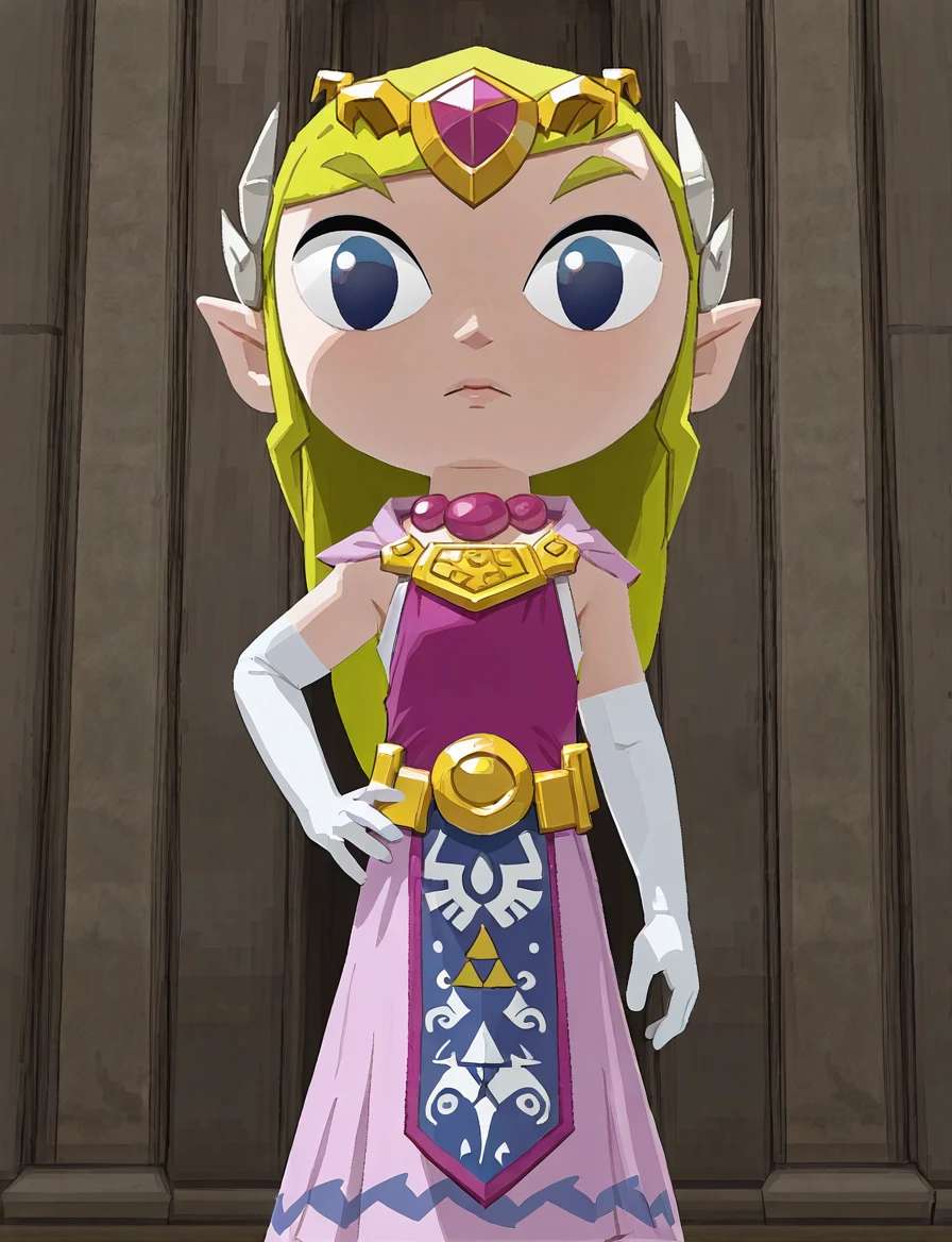 toonzelda, 1girl, solo, pointy ears, pink dress, long hair, hair ornament, capelet, blonde hair, tabard, elbow gloves, pearl necklace, low poly, blue eyes, belt,