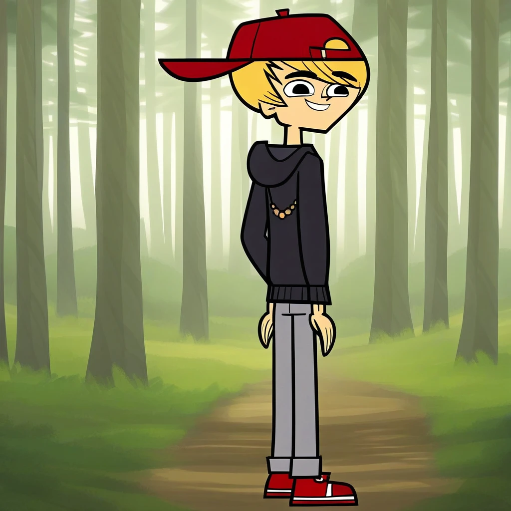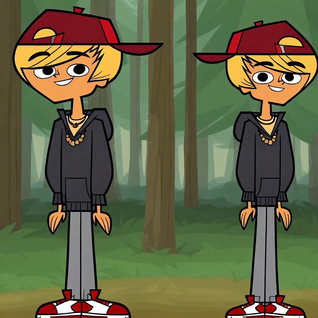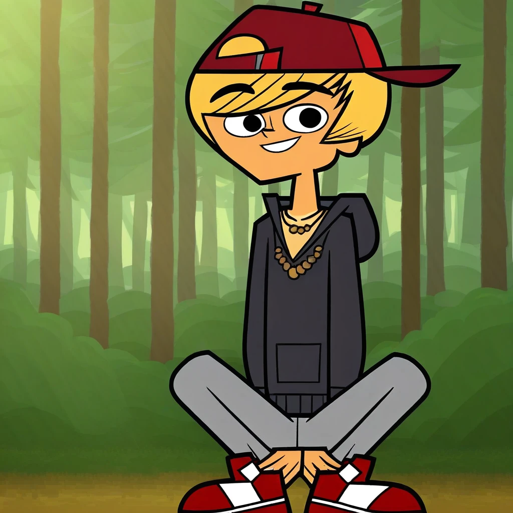 Dwayn3Jr, 1boy, solo, blonde hair, black eyes, black hoodie, tan shirt underneath, hood, grey pants, red and white shoes, baseball cap, red baseball cap, backwards hat, necklace
