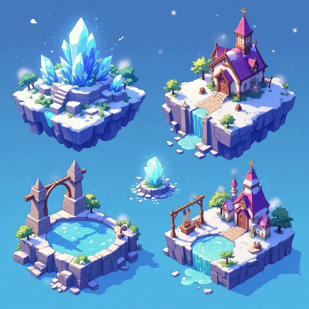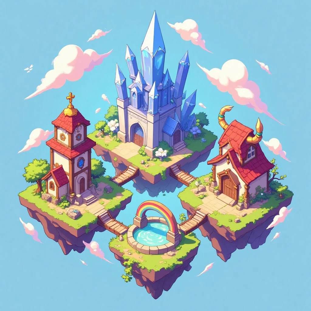 Isometric game scene designs, floating sky islands, crystal spires, fluffy clouds, rainbow bridges, bright hues, magical vibe.
