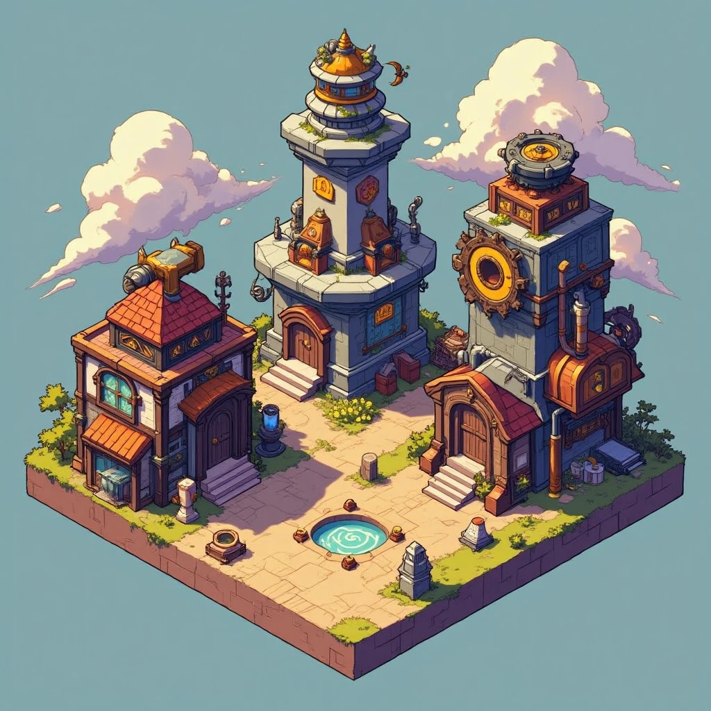 Isometric game scene designs, steampunk city, gear - filled towers, steam pipes, brass accents, metallic grays, industrial energy.