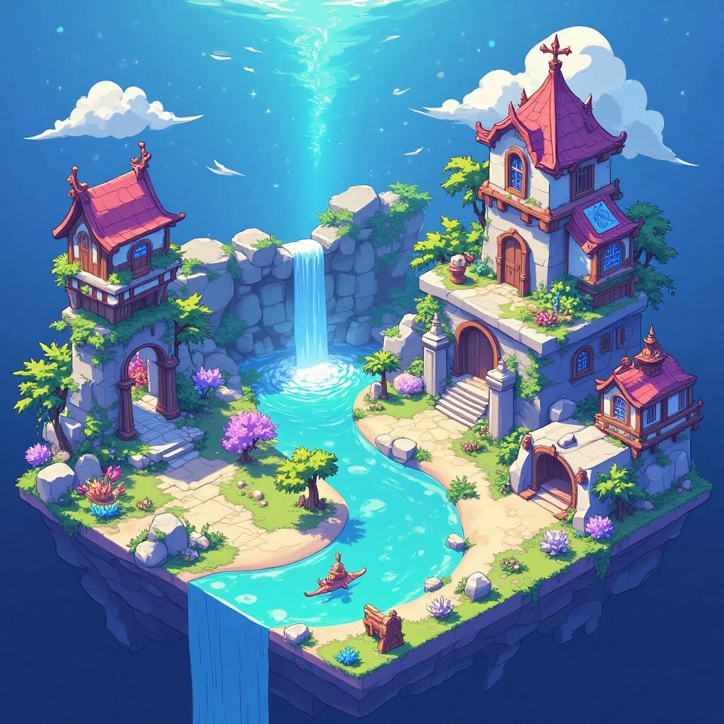 Isometric game scene designs, underwater kingdom, coral palaces, swimming merfolk, bubbling streams, ocean blues, tranquil beauty.