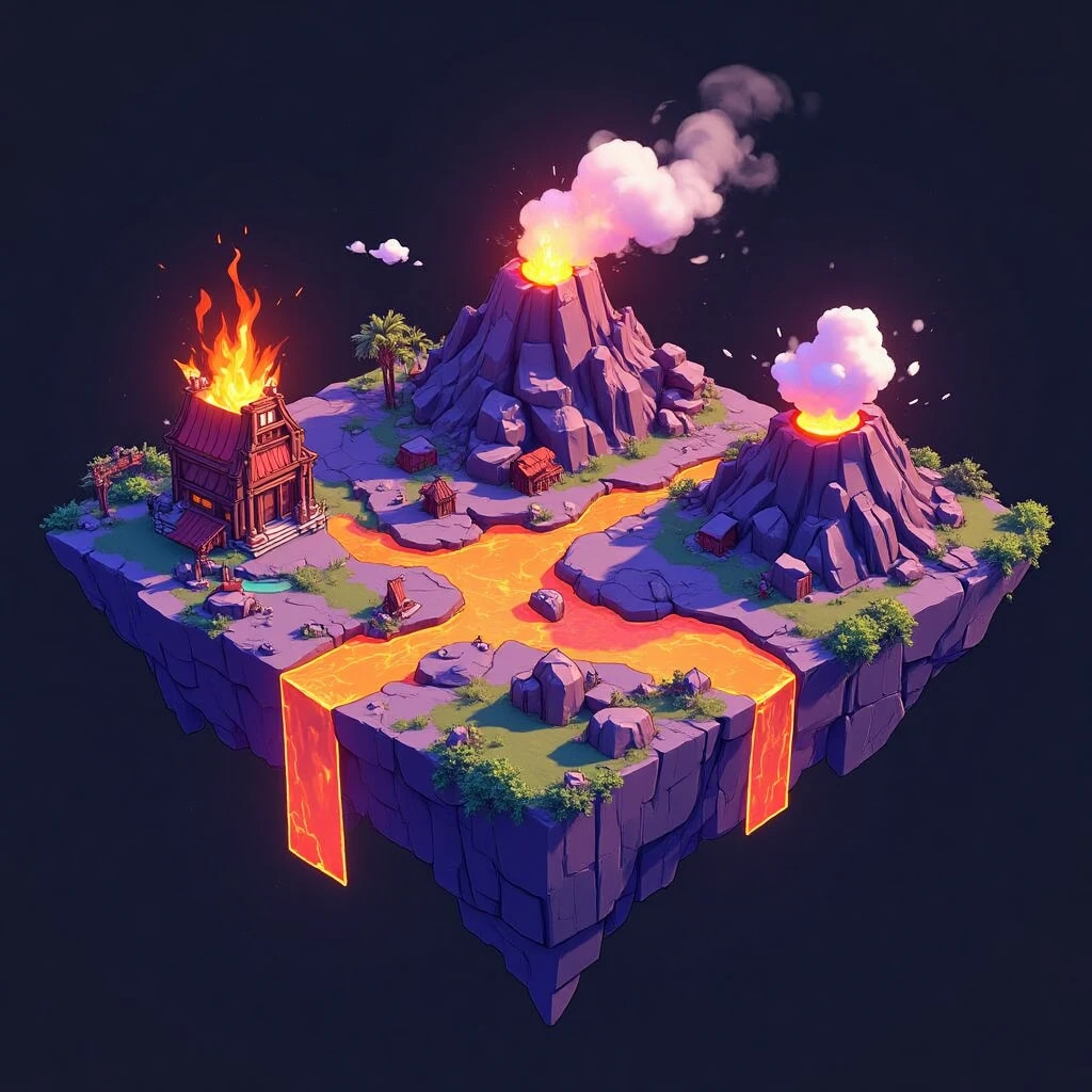 Isometric game scene designs, volcanic island, lava rivers, smoking peaks, rocky terrain, fiery reds, intense atmosphere.